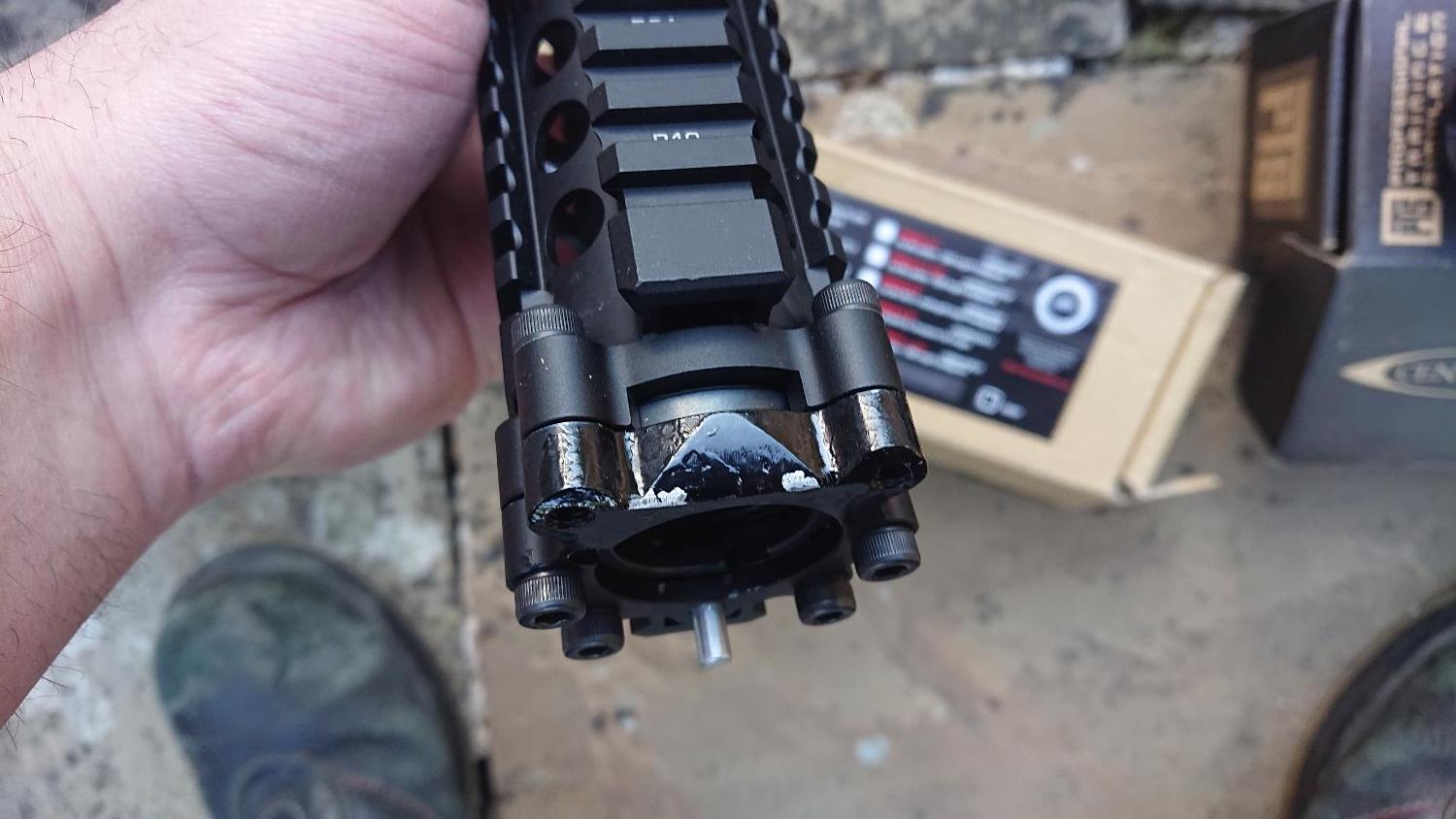 46 Madbull mk 18 9 inch handguard with barrel nut. Some damage to the rear and what seems to be some glue on it. See pictures. Otherwise complete with barrel nut SOLD