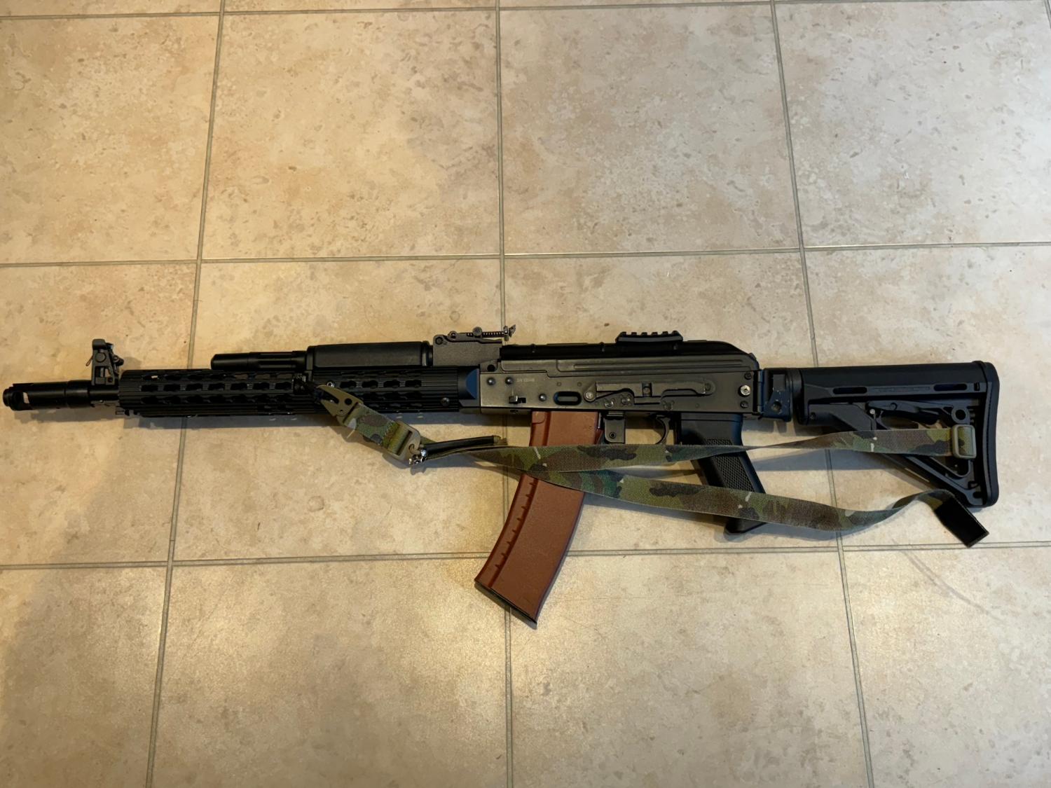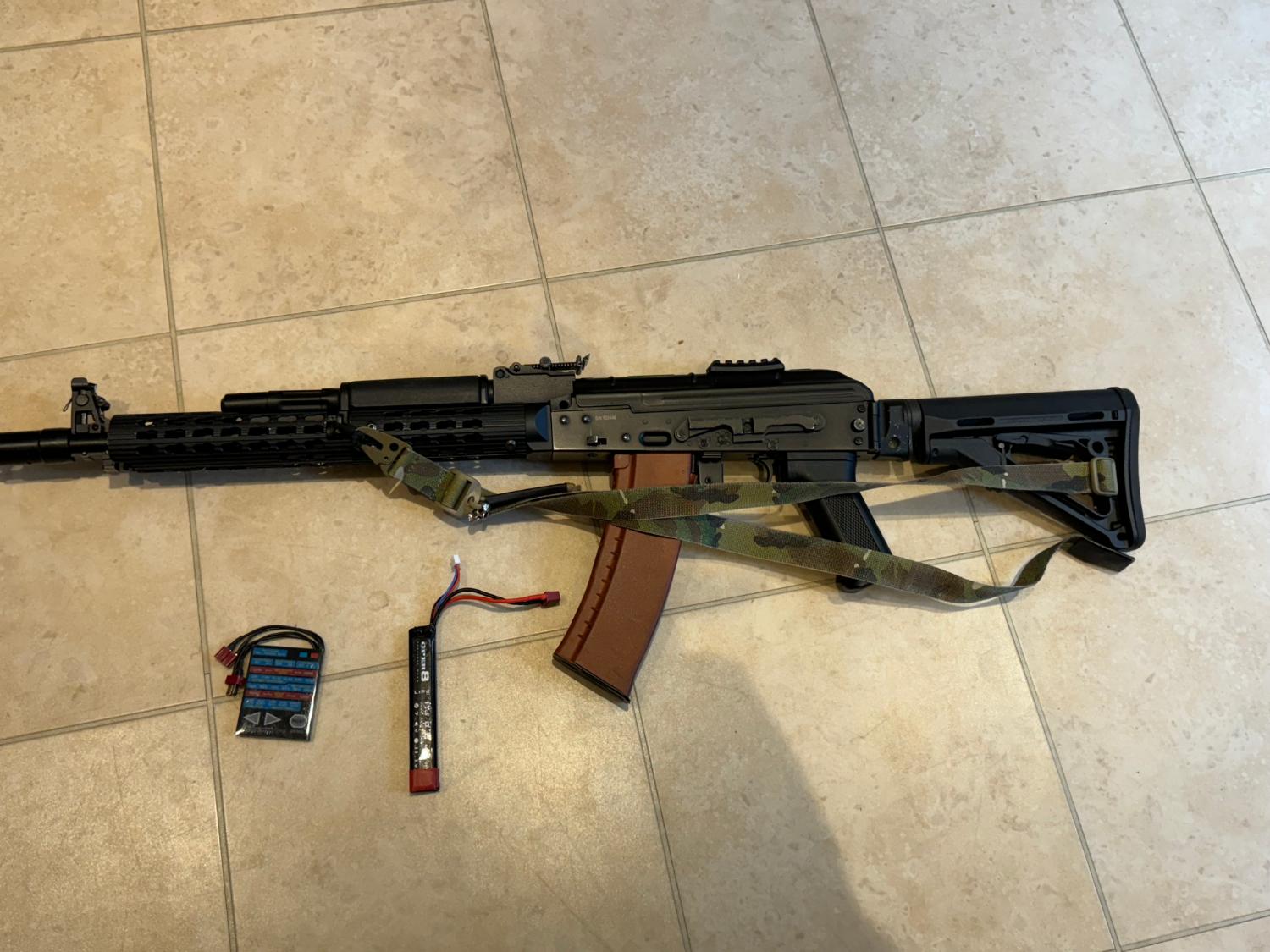 Cyma ak 74 with gate warfet installed. Prometheus Purple Hop Rubber, zci Steel 460x6.02 inner barrel and SHS m90 spring. Externally it has an 5ku stock adaptor with genuine magpul stock, vs-24 tubular hand guard with m lock hand stopper, also has genuine ak German night sights installed front and rear. Any questions feel free to ask. Open to offers