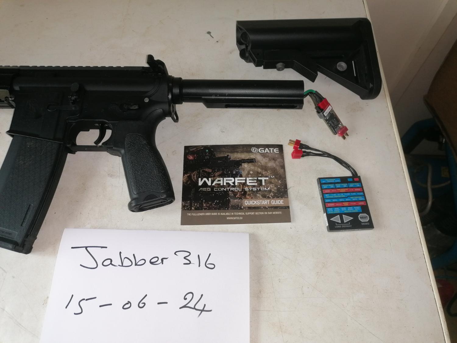 gearbox re-shimmed , maple leaf hop rubber, gearbox cleaned and regreased, a Gate Warfet installed and set up to only run with an 11.1v battery, has an after market handguard fitted too, snappy trigger response good range only skirmished once so pretty much brand new i dont airsoft any more so seems a waste to just keep it in the cupboard comes with the instructions for the Warfet and the programming card...+£20 postage....
