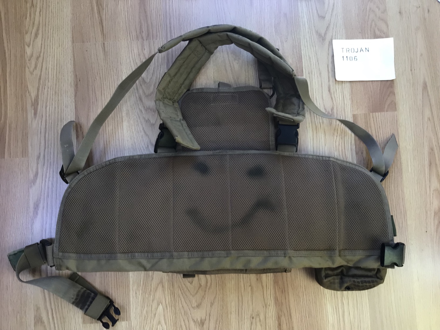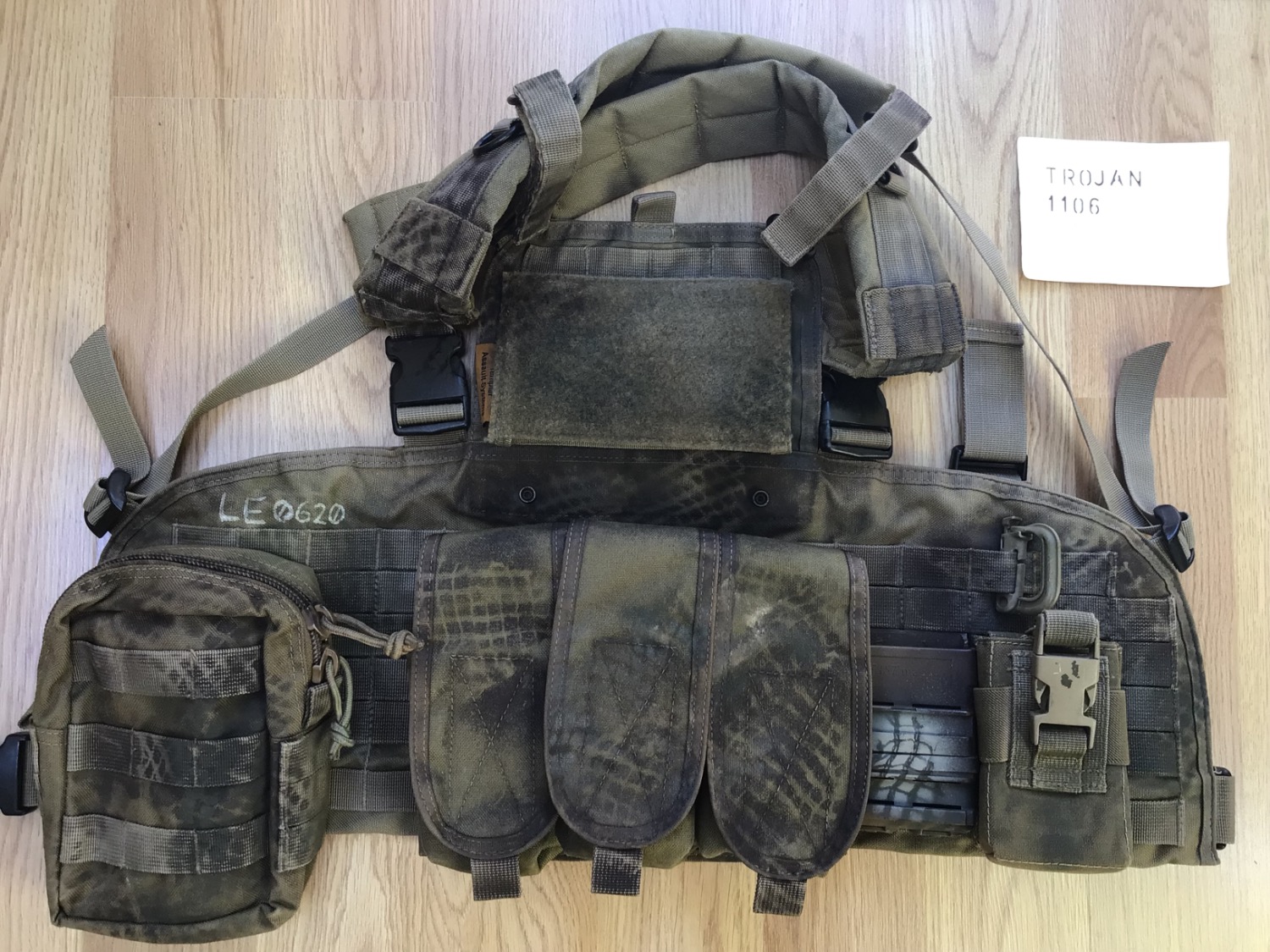 For sale, Warrior Assault Systems 901 chest rig in coyote tan, sprayed to look cool! Complete as seen, with triple double mag pouches, utility, radio, Velcro panel (all Warrior), original fast mag & carabiner.