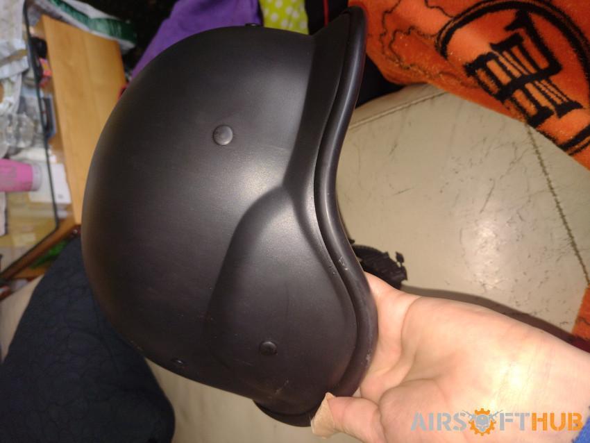 The black helmet is plain, no attachments, and really strong material,has some lite markings( was in the wardrobe for a good while apologies ) has ear cover....