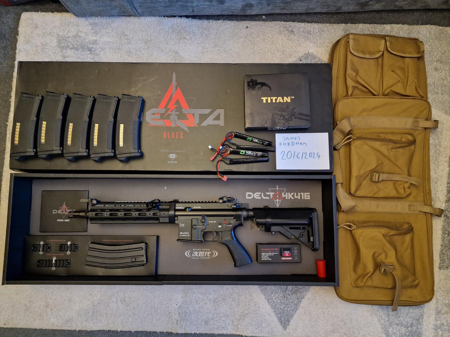 Here I have for sale my Tokyo Marui HK416 Delta Black. The gun is in practically new condition. Bought it brand new and used for a couple of short game days. Then had some upgrades installed in it by a tech and used for one game after that. Since then I only do cqb since a new site opened near me and I prefer to use gas for that so this dosen't get any use. I will list the upgrades below and also see the gate titan screenshot to see the specs. This thing shoots .28s just under the limit at crazy range. Insane build quality and reliability as expected from tm. Has been rewired to deans. Also comes with 5 pts ngrs magazines and a gun bag all in box as new and two 1450mah 30c 7.4v lipo batterries that were bought new for this gun. Upgrades are as follows.