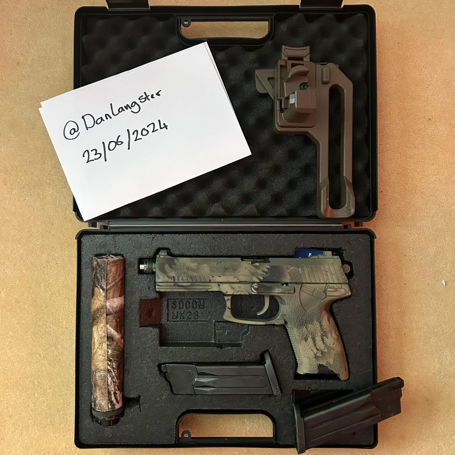 Comes with an original (wrapped in camo) TM Suppressor filled with foam baffles to dampen the sound, DTD holster and molle adapter for the holster, 2 TM MK23 mags (hard to find in stock at the moment) and an original TM carry case.