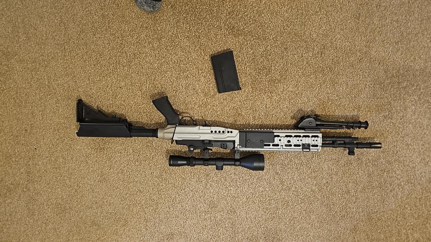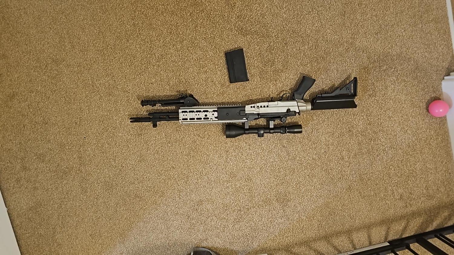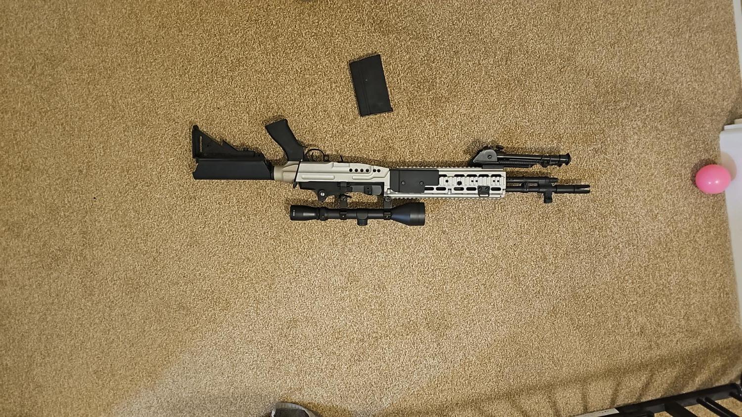 M14 EBR comes with, adjustable bipod, crane stock, 9x telescopic 1x hicap magazine.