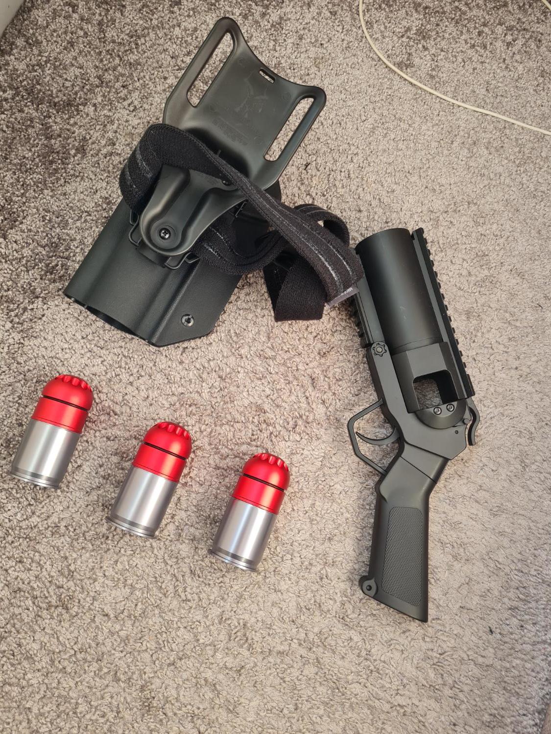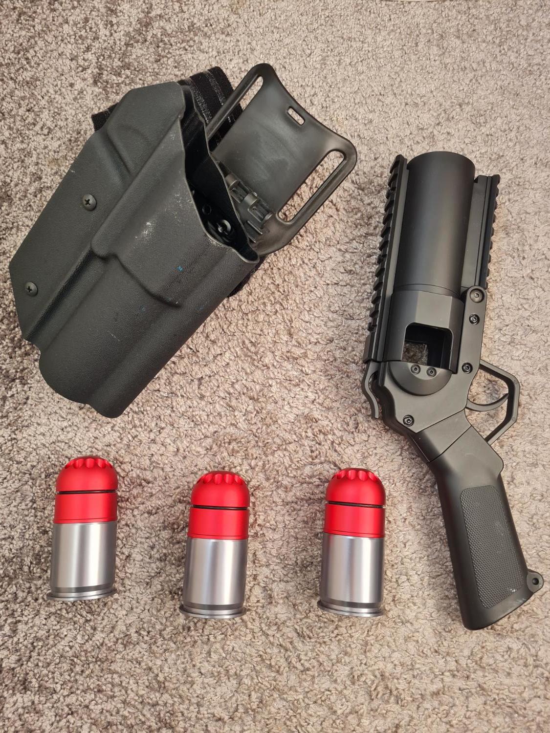 Nuprol hand cannon like new comes with 3 grenades and a kydex holster, used for 1 game only used 1 moscart others never been used.