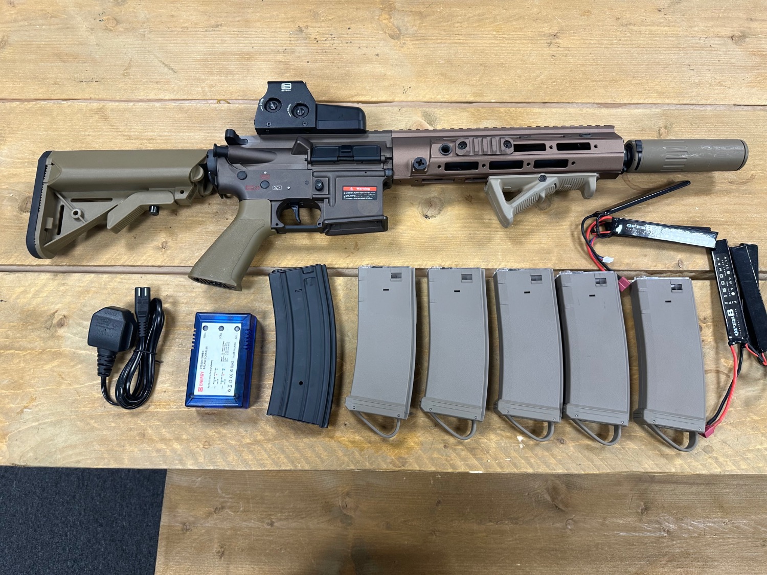 It comes with everything in the pictures 5 x Modify 150rd mid cap magazines, a battery charger and 2 x Oper8 11.1v 1500mah batteries, GHT Eotech holographic sight, and an angled foregrip. The gun shoots flawlessly at 325fps on .20's, I do have a video of it if you want to see it in action.