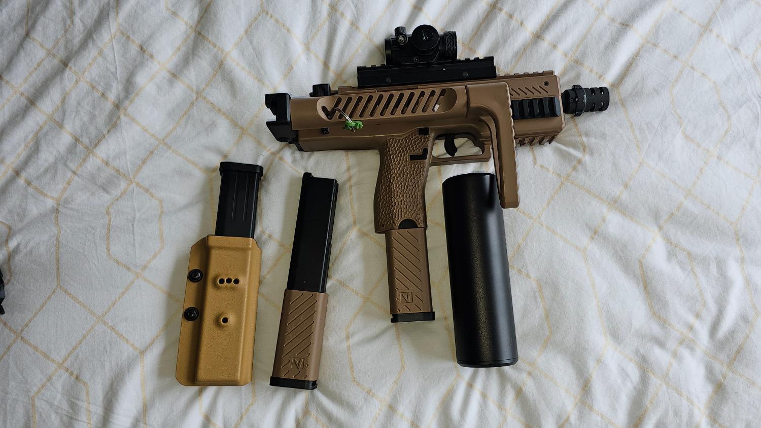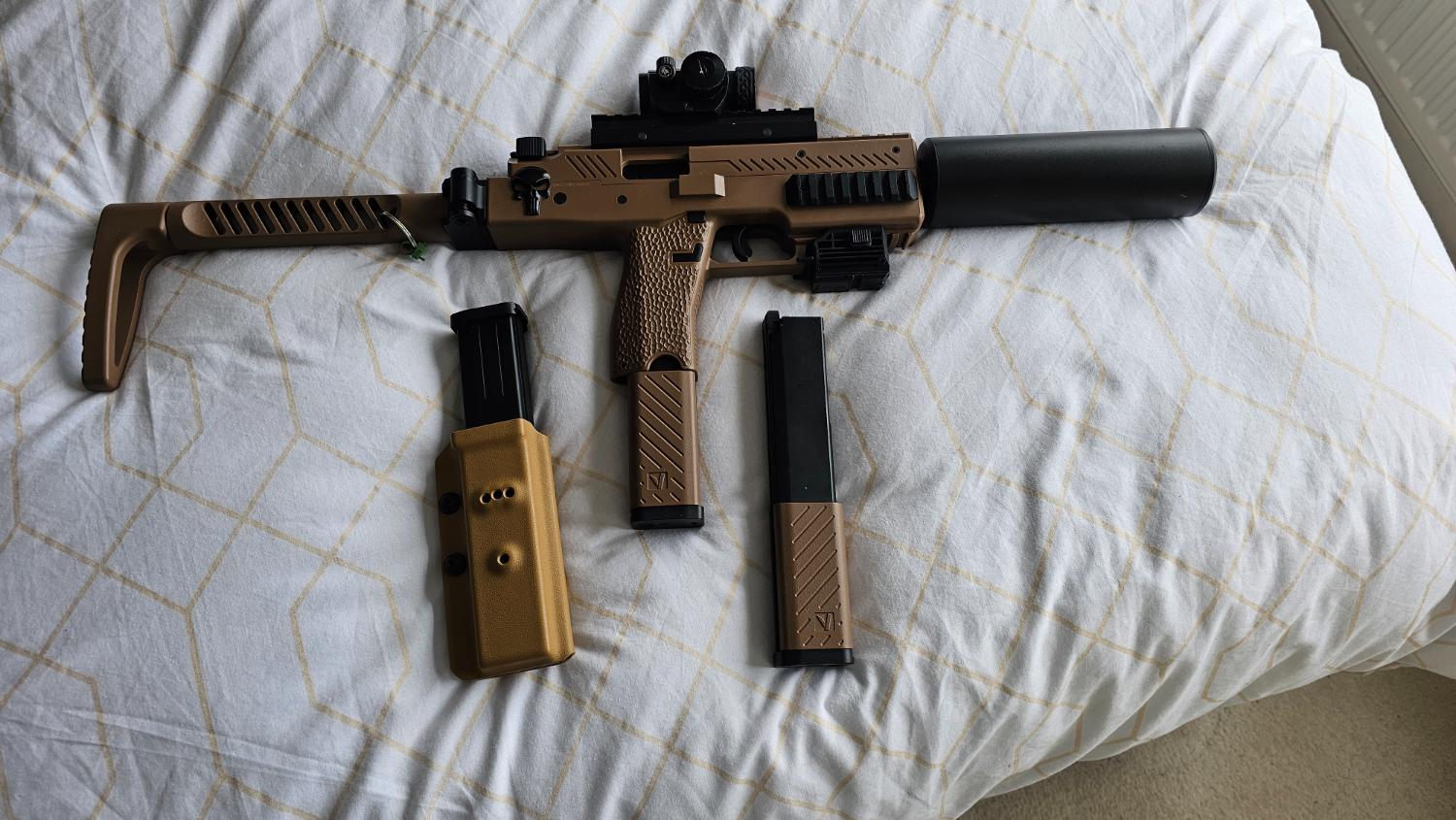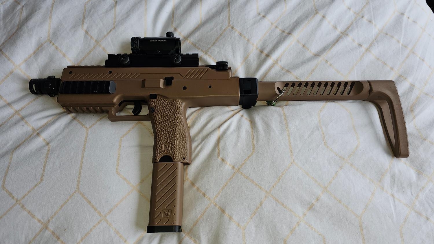 VMP-1X PDW in tan colorway comes with 3 leak free mags lancer tactical sight and deadly customs mag holder boxed