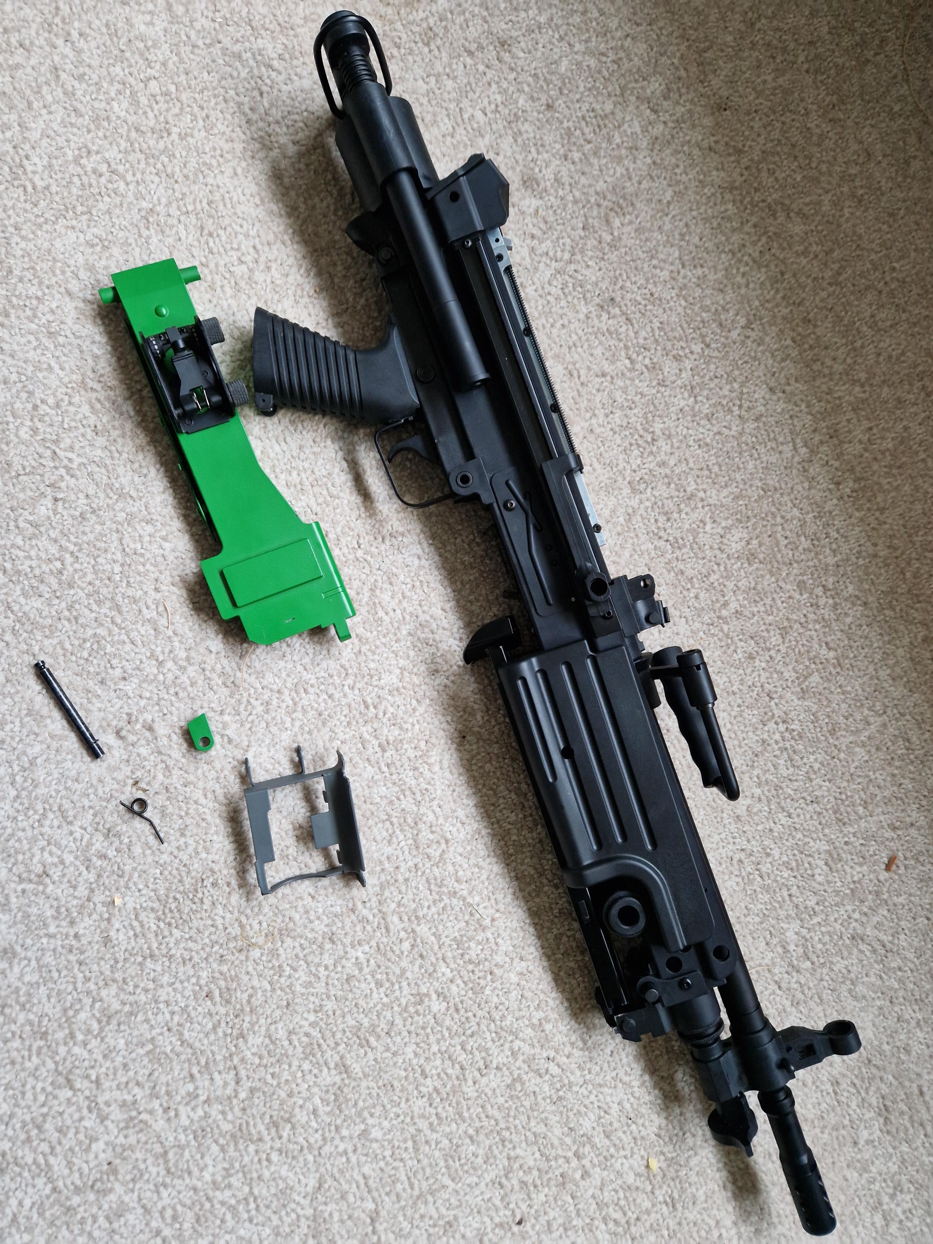 It's a specna m249 polymer version. Its missing a rear stock pin, heat shield, top cover (although it does come with a 2 tone metal top cover that is broken). The mag release is also broken but it shoots if you hold an m4 mag in it. The grip is wobbly and the grip cover spring is bent and loose. No box mag. I think that's everything. Please check the photos or ask is you're not sure about anything.