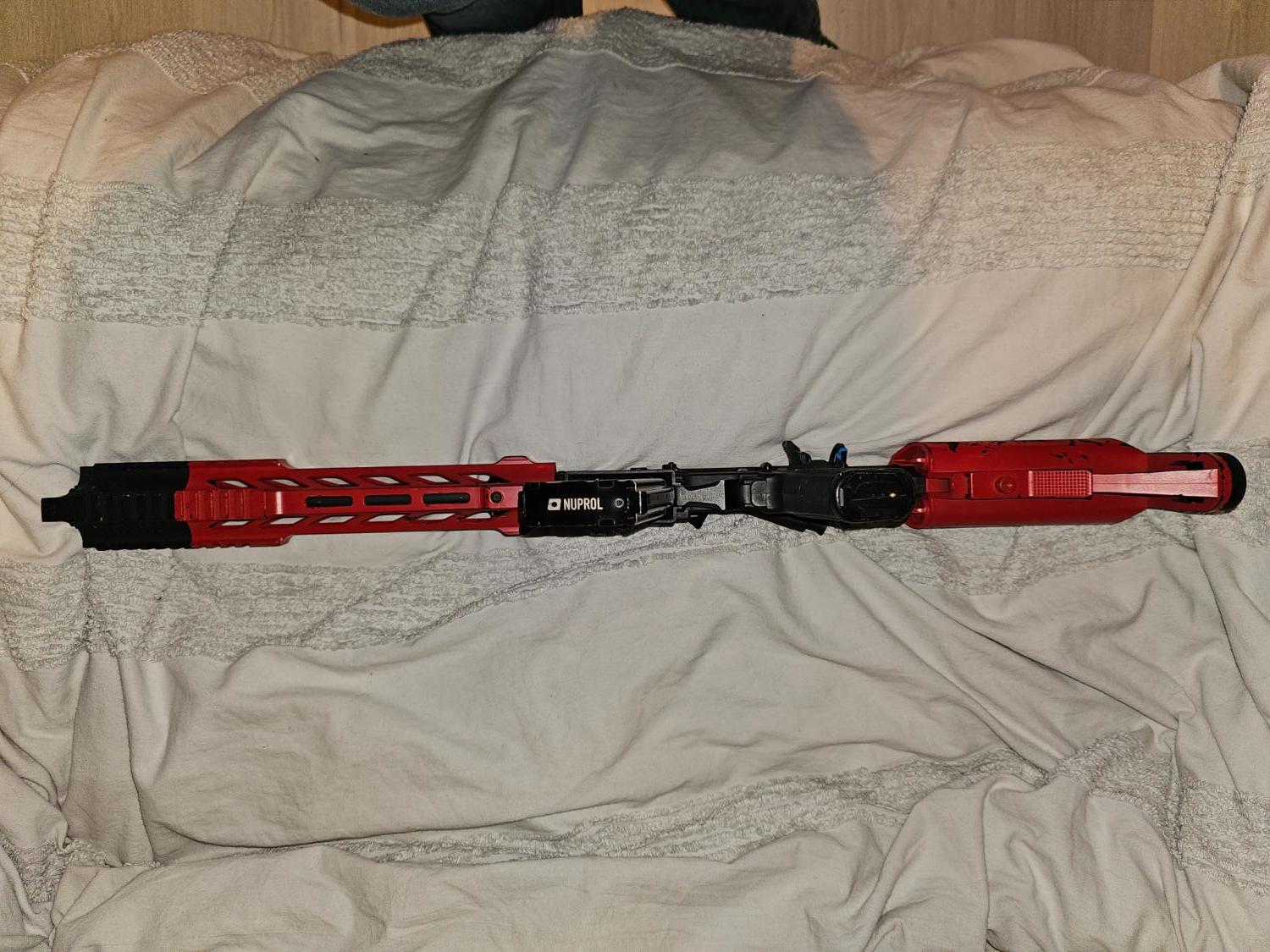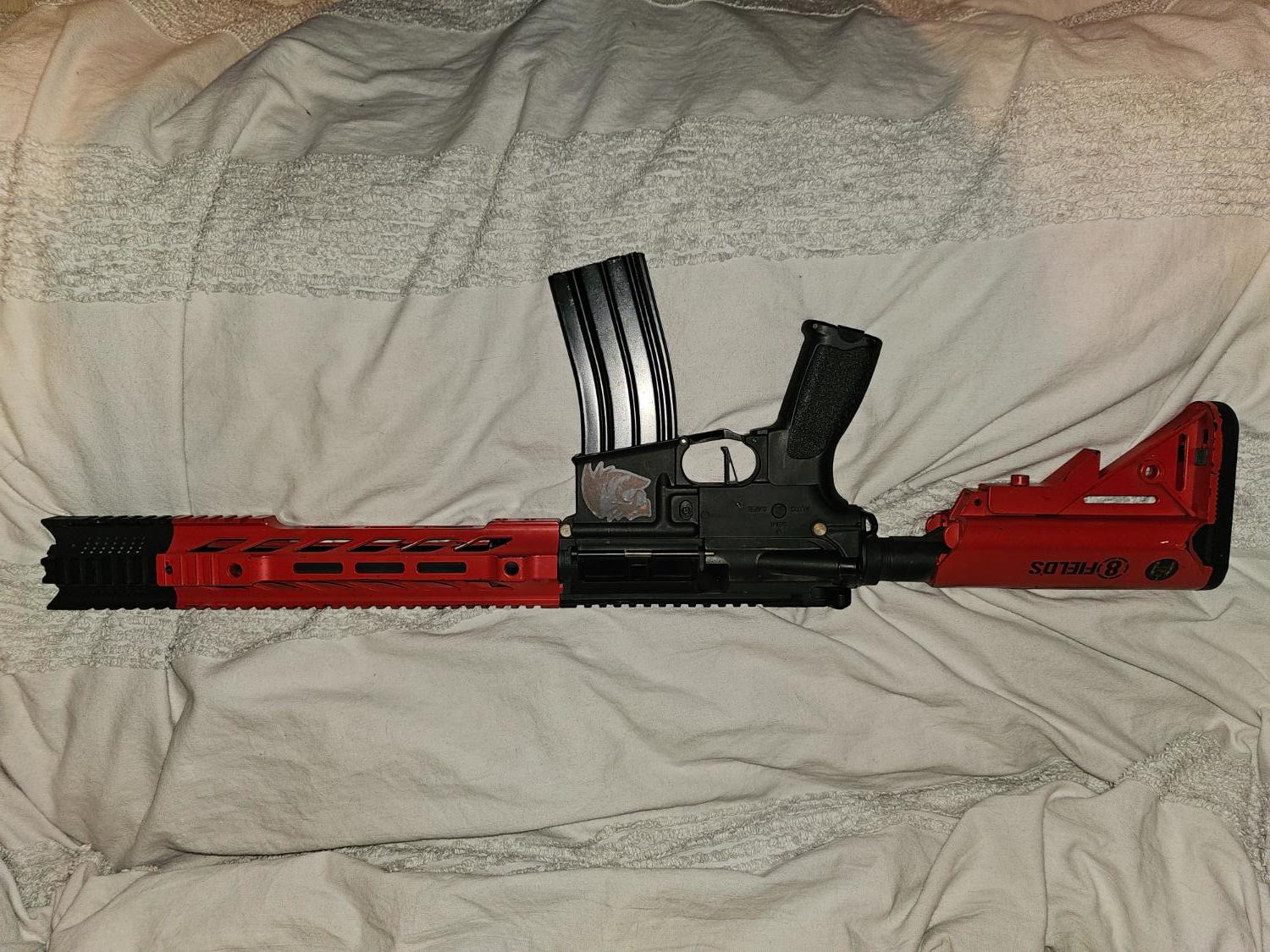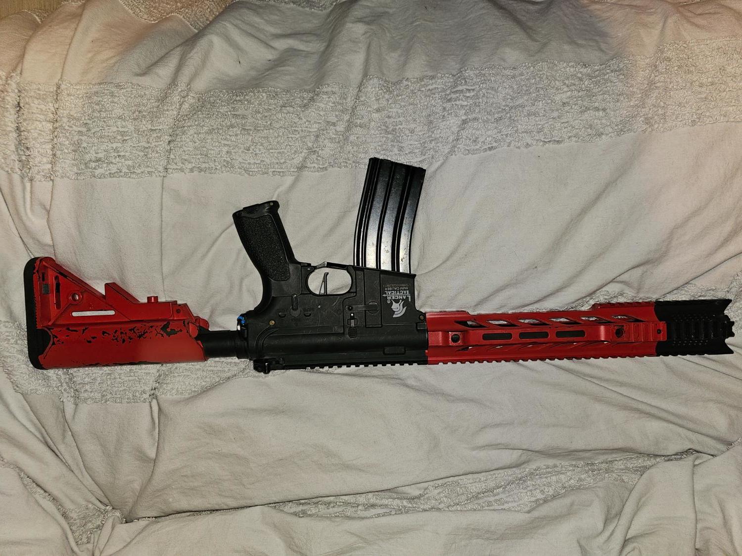 selling my lancer tactical LT-25, is in good condition but does show signs of wear as I have used it in a few games. Is 2 tone red and black. Comes with its original high cap, Iron sights and compensator. Any questions feel free to ask.