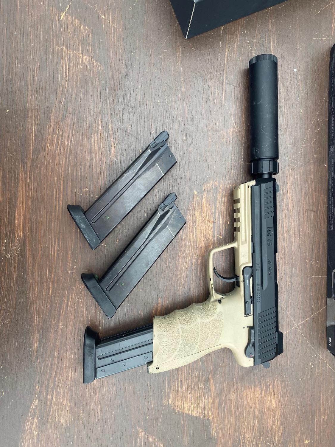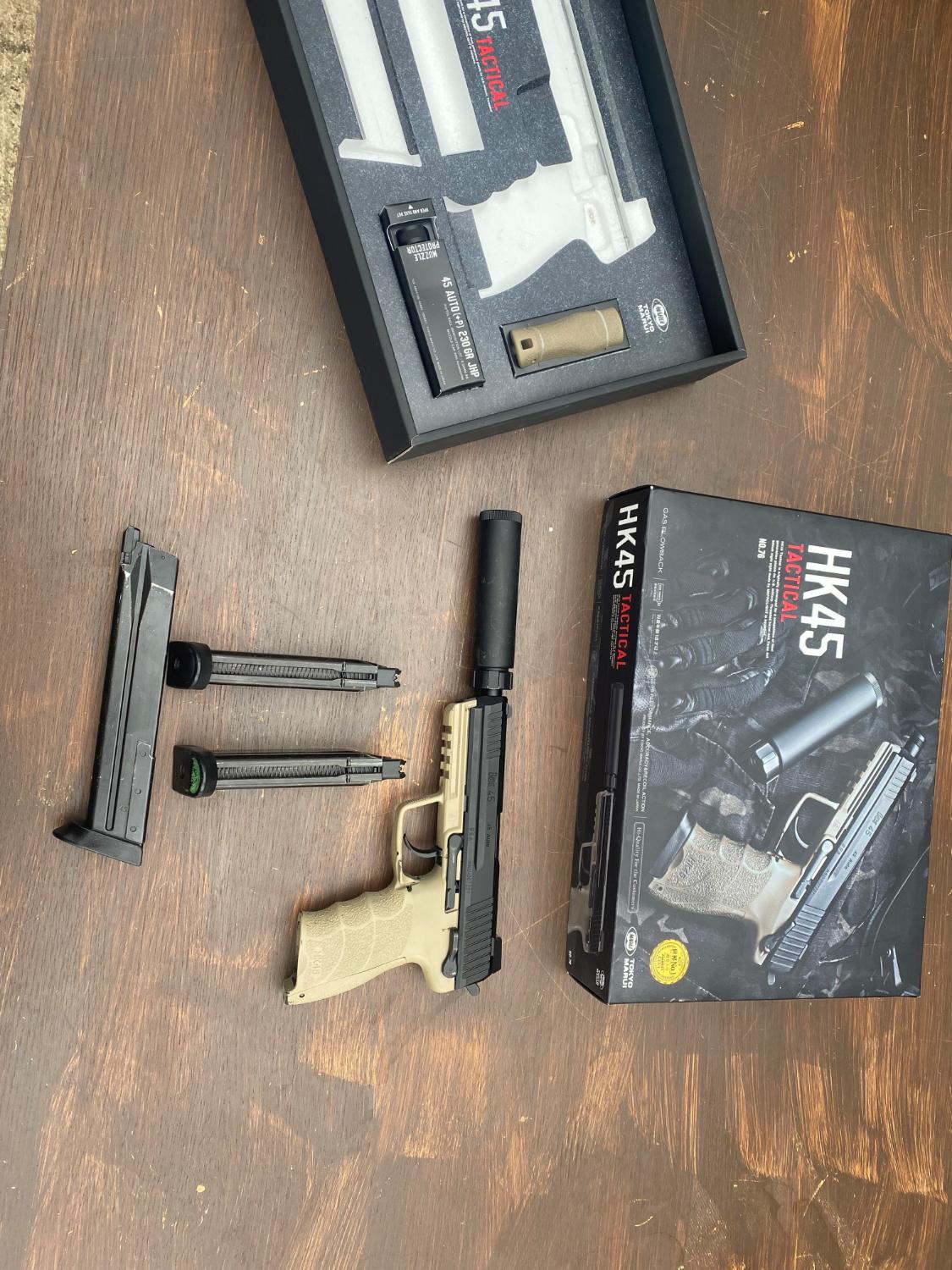 TM HK45 upgraded with Maple Leaf inner barrel & Pink Flamingo Hop rubber. In original box with the suppressor and back straps that come with it. 2 standard mags and one extended. Brilliant gun, but i have 3 of them so don't need this one