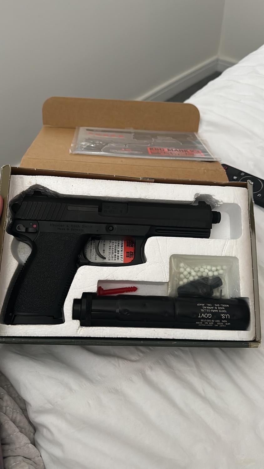 Hi there I have a rare 2005 version of the KSC Socom MK23 pistol it’s Gas blowback it has a metal slide and it has a kick to it I can add videos of it shooting so you can see it’s a beast of a pistol similar size to the desert eagle Iv added a Tokyo Marui supressor just for looks I’ll add it for free if wanted I’m wanting £190 as Iv seen these sell for £230 to £250 because you can’t get them anymore but I’m open to offers so shoot away ? buyer pays postage PayPal payment any question email me [email protected] ore text me 07530689244