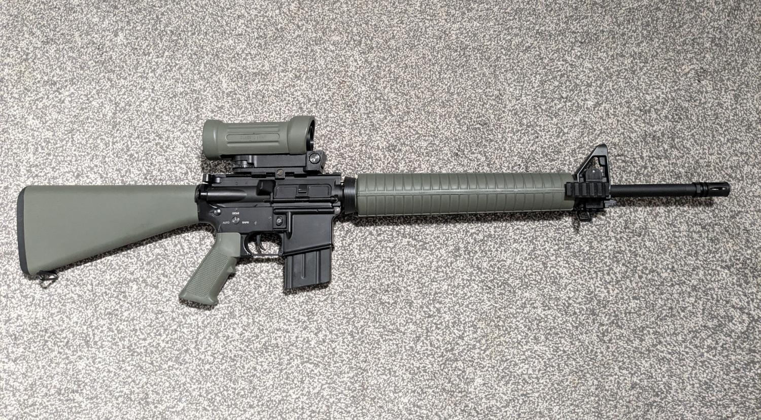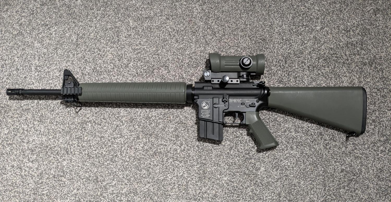 Here's my M16A3 AEG modified to resemble Canada's C7A1. I put this together as a frustration project after being extremely disappointed with G&G's attempt at the C7A1. It's in good shape all round with some signs of skirmishing and the odd mark here and there. This is based on a Double Bell M16A3, and as such it still has the Colt and US Govt emblem on the receiver. The furniture and the rubber housing for the M145 sight have been painted using Krylon and has been done pretty well, these parts were removed for painting so there's zero overspray etc. There's a 3D-printed tri-rail section fitted to the front sight triangle as per the C7A1. Internal mods as follows: