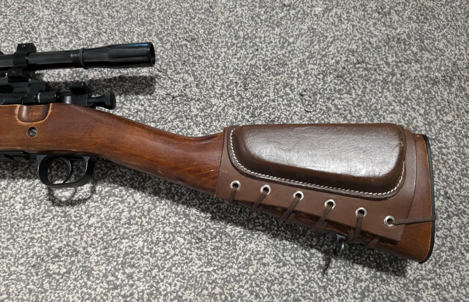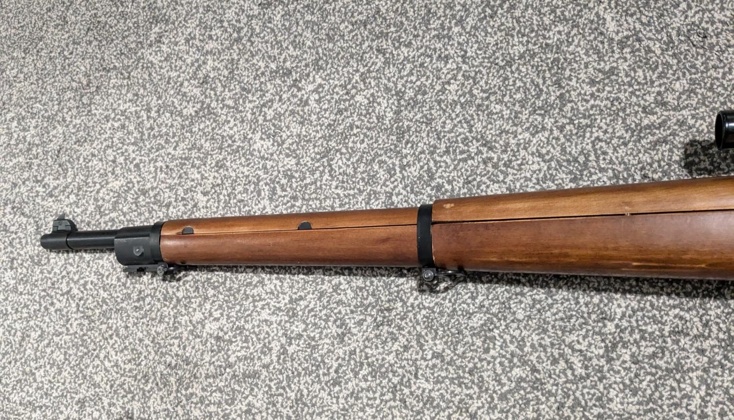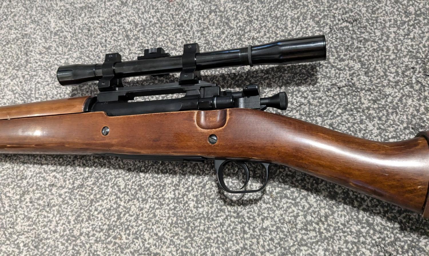 This is an S&T M1903 Springfield rifle fitted with a Parker-Hale branded 3x scope. It's in good all round shape, the finish on the wooden stock has been slightly polished and darkened to make it look and feel better than the standard matte finish. Some marks from skirmishing but overall this has had fairly light use. Internal mods as follows: