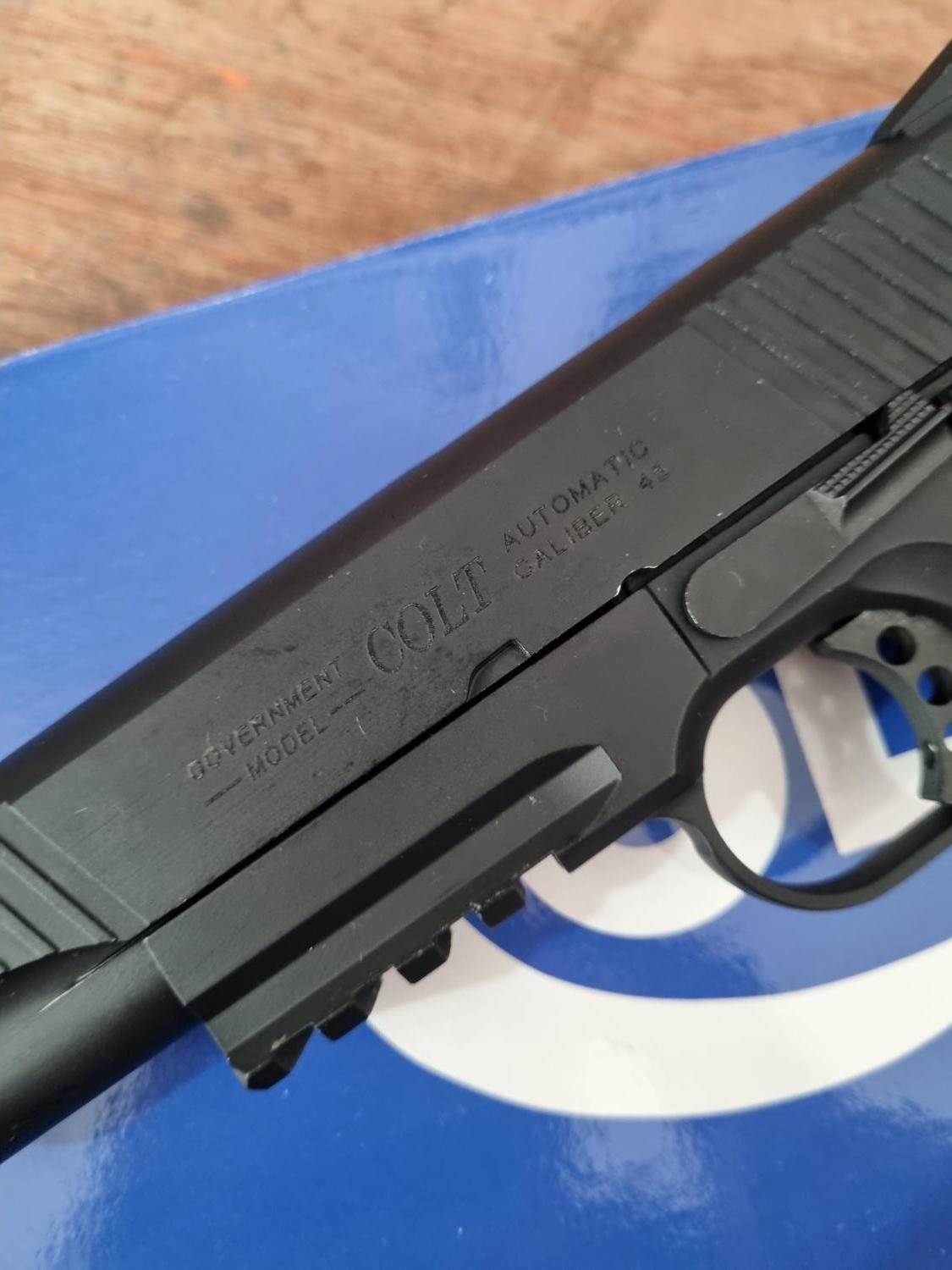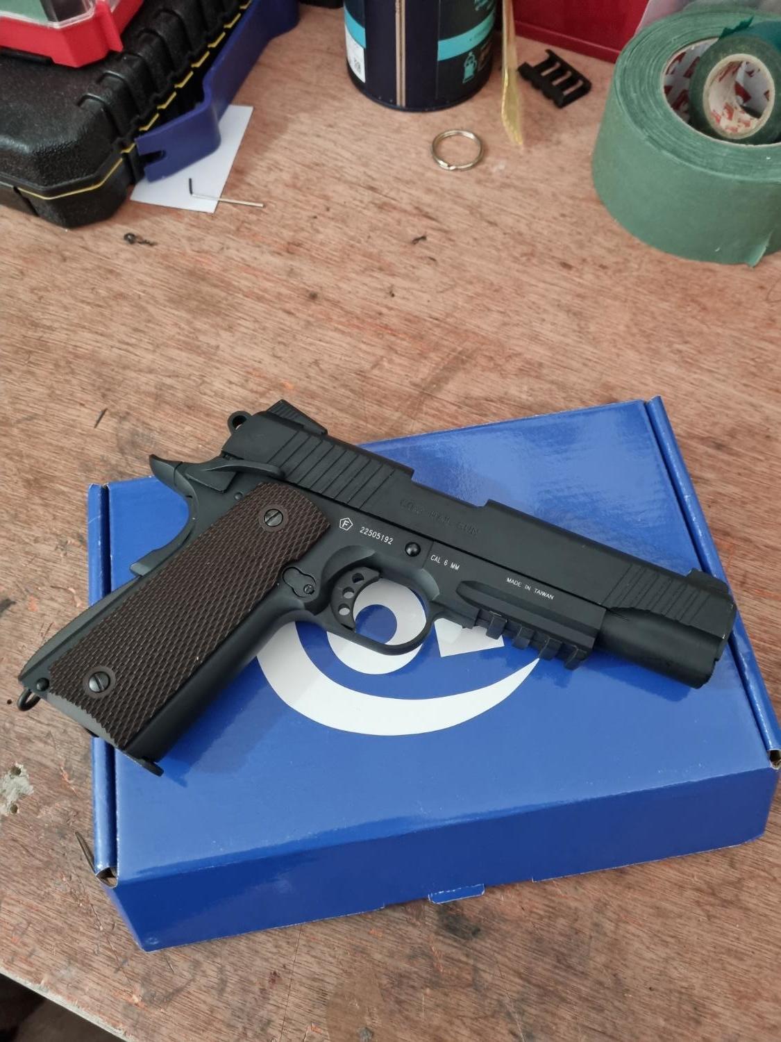 Cybergun 1911 rail gun, colt licensed, co2 powered, comes with one leak free mag, full metal with a1 style plastic grips, comes with barrel thread adaptor for attaching a muzzle device. Used but in good condition. Low price for quick sale