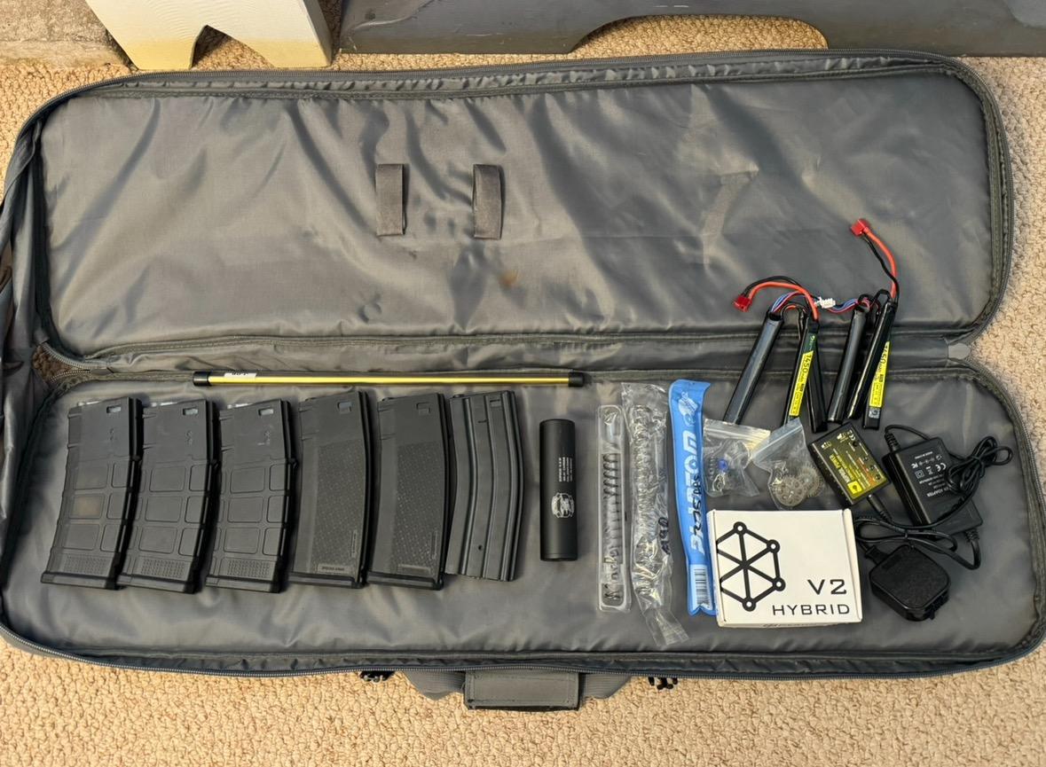 Included will be two 11.1v batteries, torch, foregrip, 3 mid caps, 3 high caps, silencer, 3 extra springs to chose your fps, battery charger, original gears and piston head, holographic sight and a soft case.