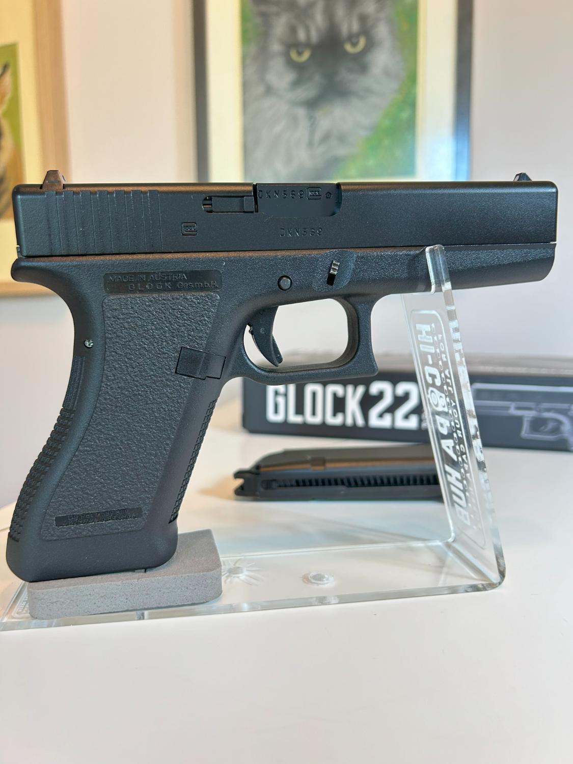 Boxed with all TM accessories. The Glock 22 is an improved version of the TM G17. It is essentially the same but has a metal insert in the slide to protect it, and a metal insert in the magazine release. It does not have the bigger bbu of the most recent Marui Glocks. However if you want to put an aluminium slide on it, you have more choice than with the Gen 4 version at present.