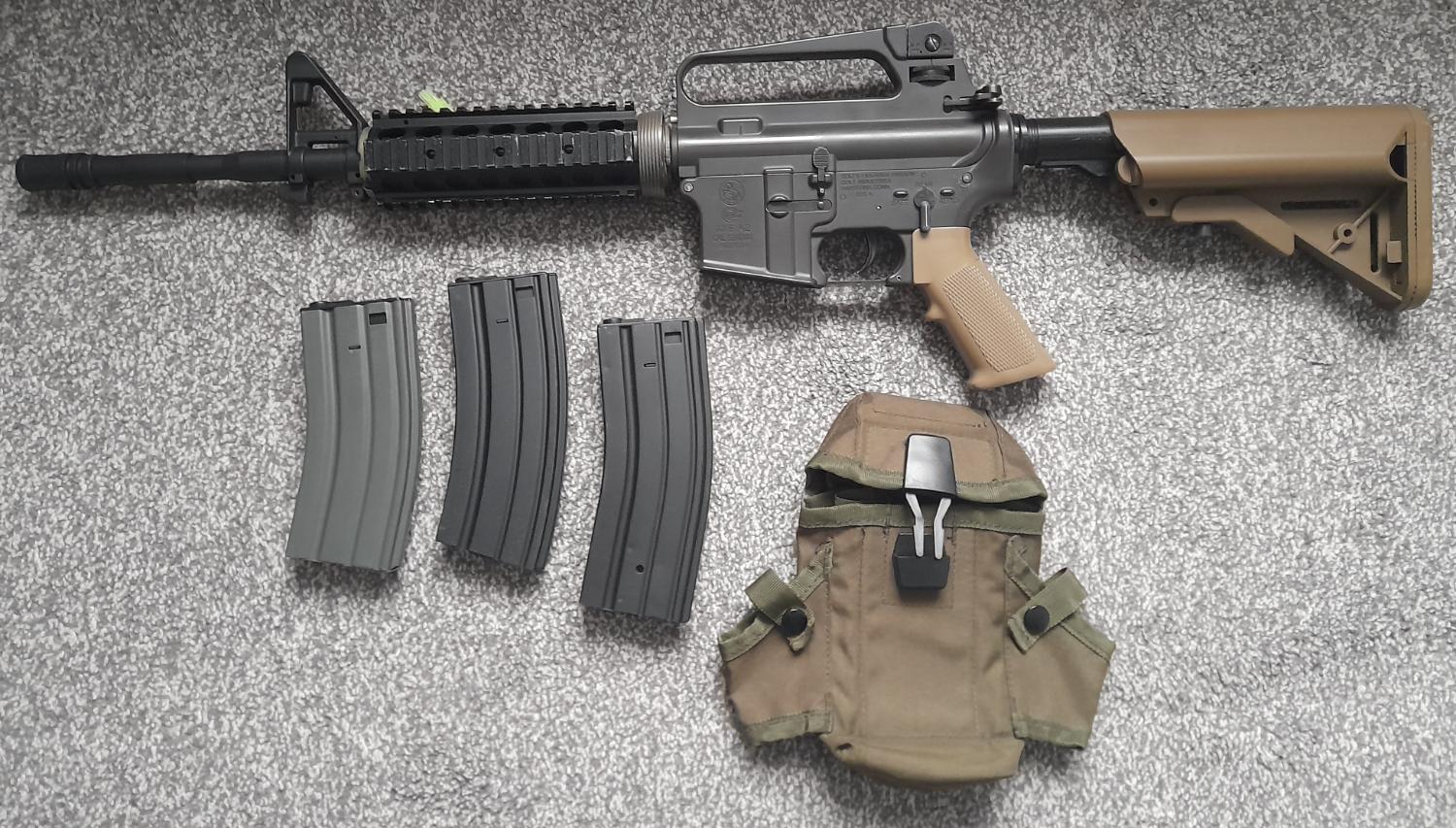Tokyo Marui M4 airsoft gun. With ris front handguard. And 3 highcap mags and alice ammo pouch.