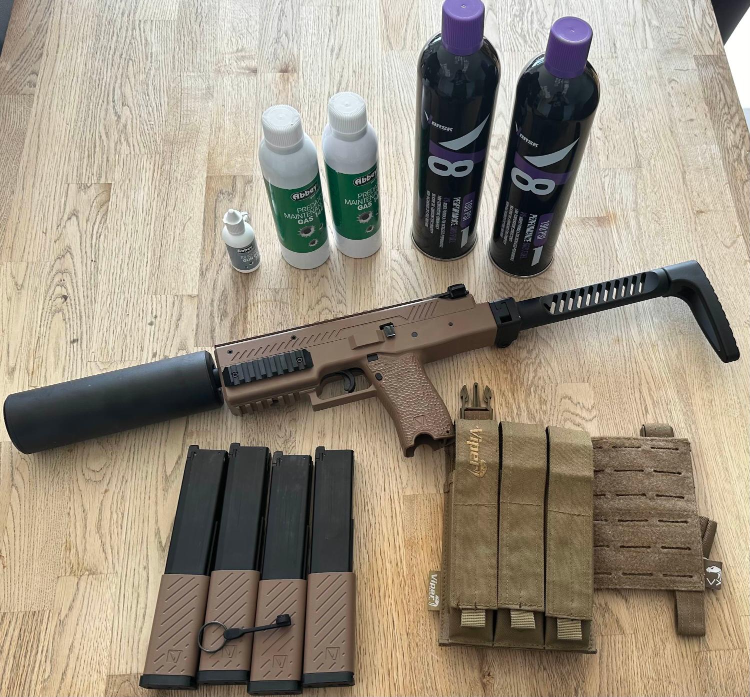 4 leak free mags, unused gas, maintenance gas, SMG mag pouch, lubricant