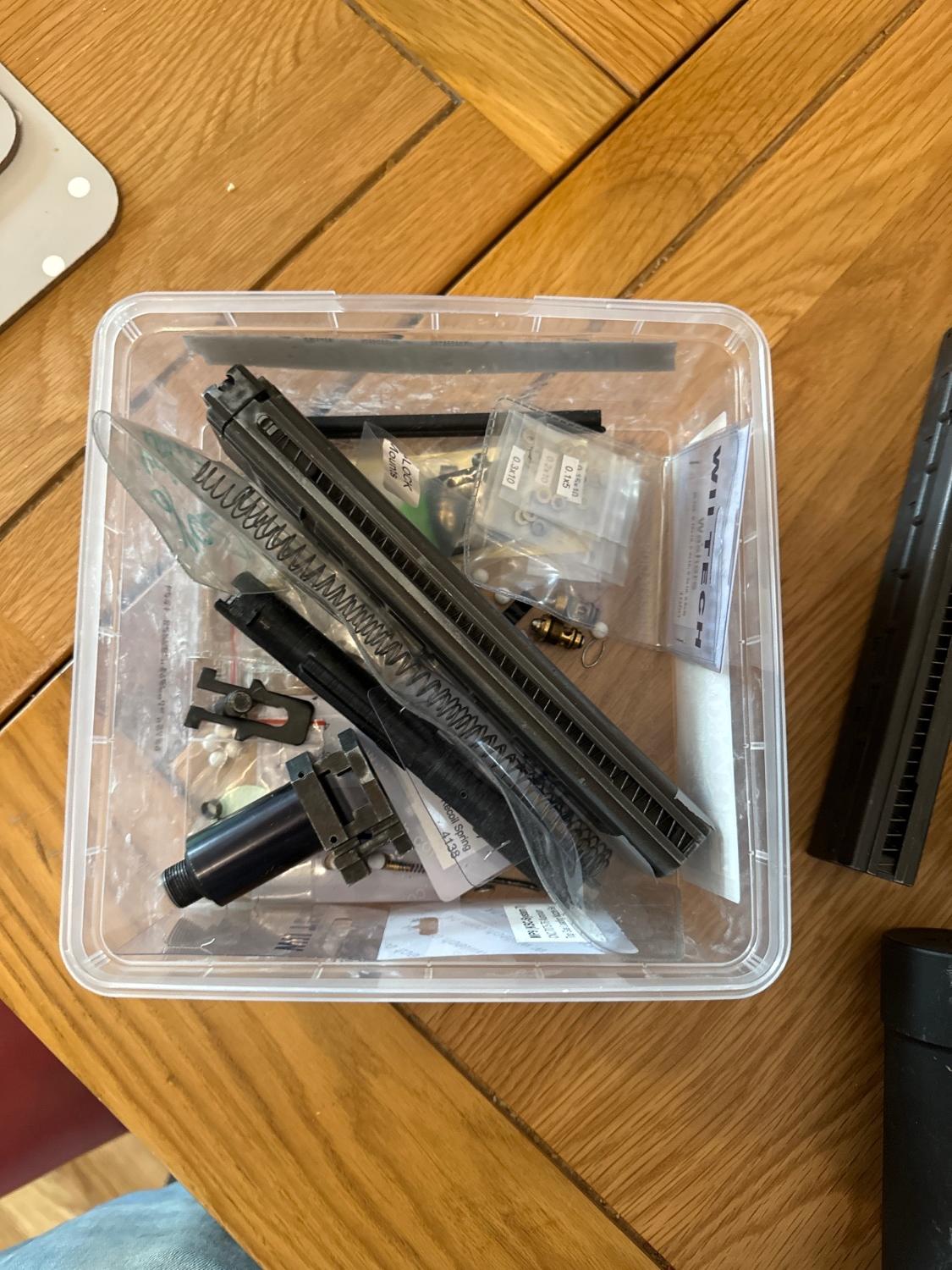 Comes with 4 mags, AIRTAC HPA m4 mag adapter (old style) dummy suppressor without foam and a box full of spare bits.