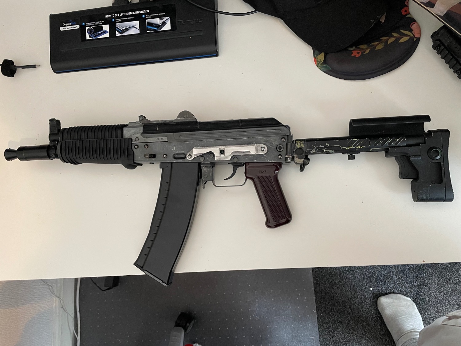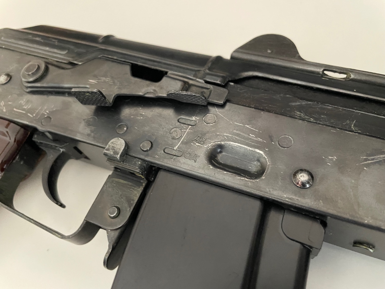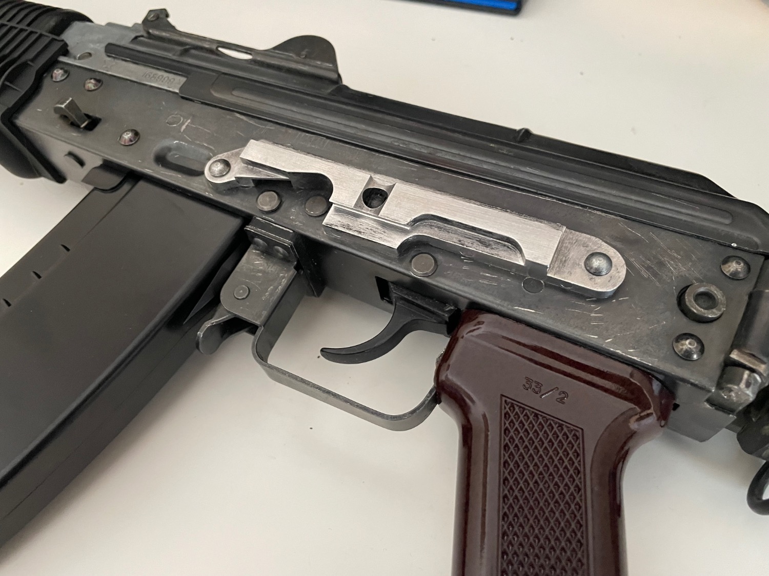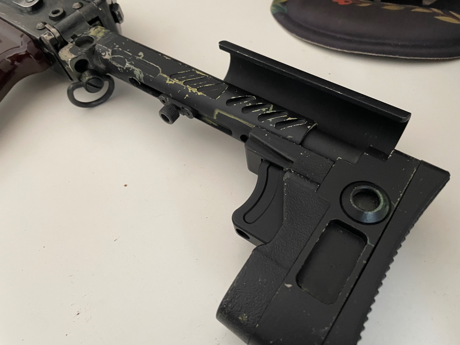 When I got this the previous owner(s) had done an extremely crusty job at painting it green for some reason (yes, the Zentico stock was painted green. I don't know why either.) and then an even crustier job painting it black ontop of that so I stripped all the paint off the body. I didn't get around to stripping the replica zentico PT-3 stock, and the paint thinner I had would have damaged the polymer handguard so I just bought a new set, though i will include the old handguard as well as the new. The holes crudely punched through the handguard were to mount rails. The top one can't hold a rail properly, however the bottom one holds a rail perfectly fine (albeit slightly angled forward due to the angle of the lower handguard by default)