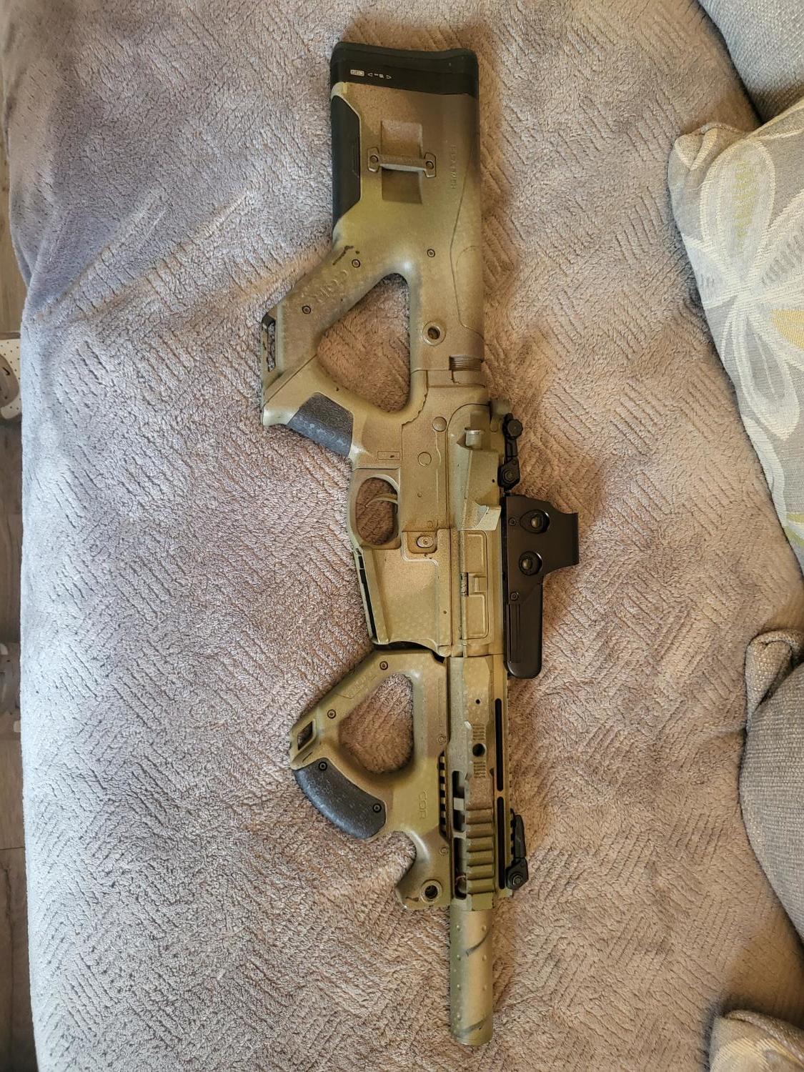 Has an upgraded hop up, red dot and suppressor. Has had a custom camo paint job but, there are a couple of paint scratches and wear patches which I prefer rather than looking pristine.