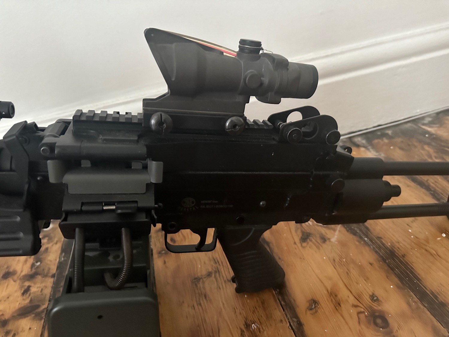 This is my fn licensed minimi para edition holds 2500 rounds in the drum shoots 11 rounds a second very good support weapon is the same weight as the real one! About 7 kg