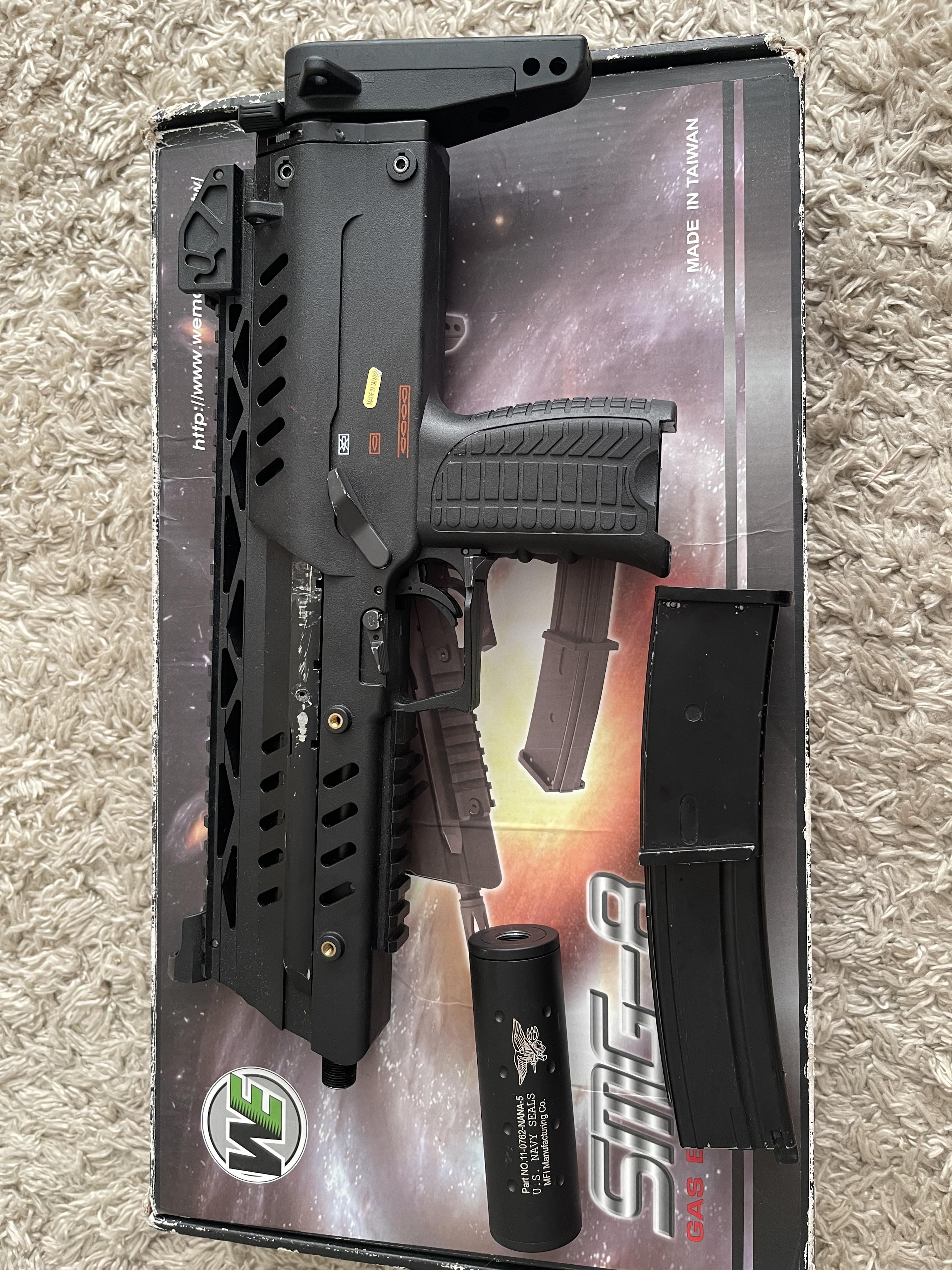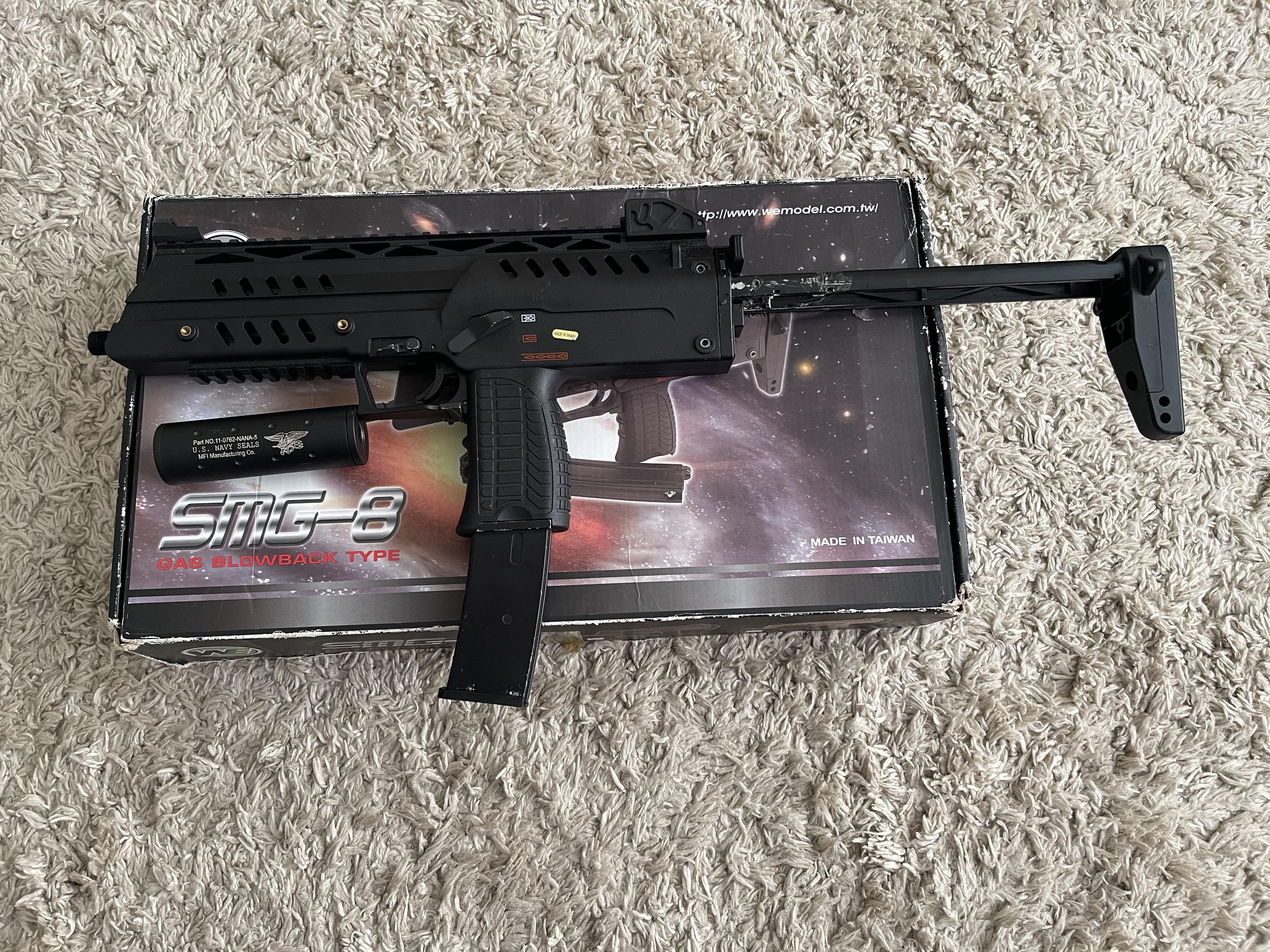 Bone yard WE SMG-8 (MP7). Signs of wear on the stock arms and magazine but in solid shape aside from that. The issue this has is that it will always mag dump as soon as you activate the bolt release. Can only assume this is a sear issue. Flash hider is missing so will include a metal suppressor.