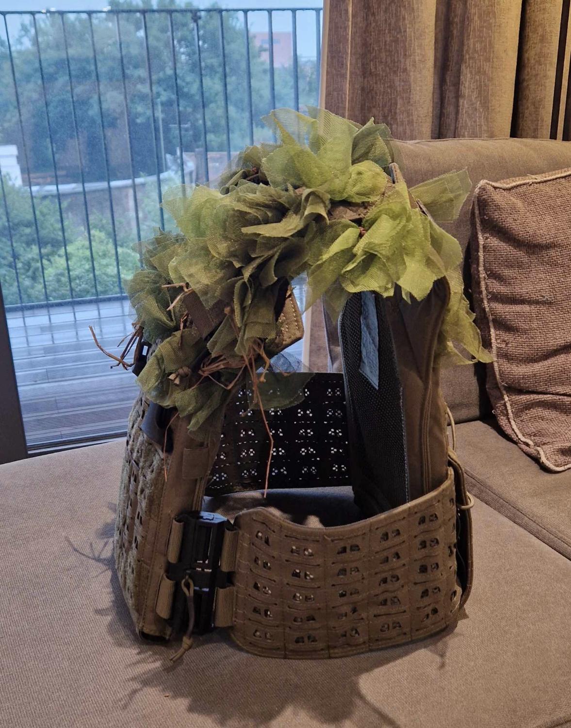 Novritsch plate carrier in green, crafted on the top third with haloscreen. If you don't want the haloscreen you can easily snip off the cable ties.