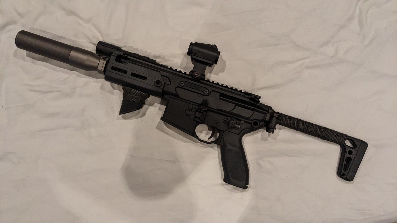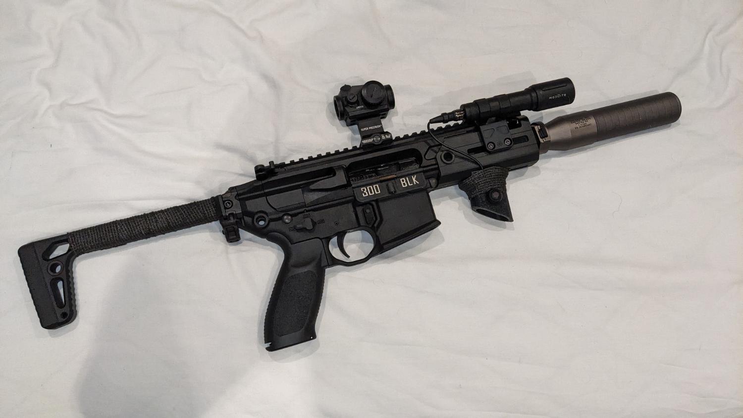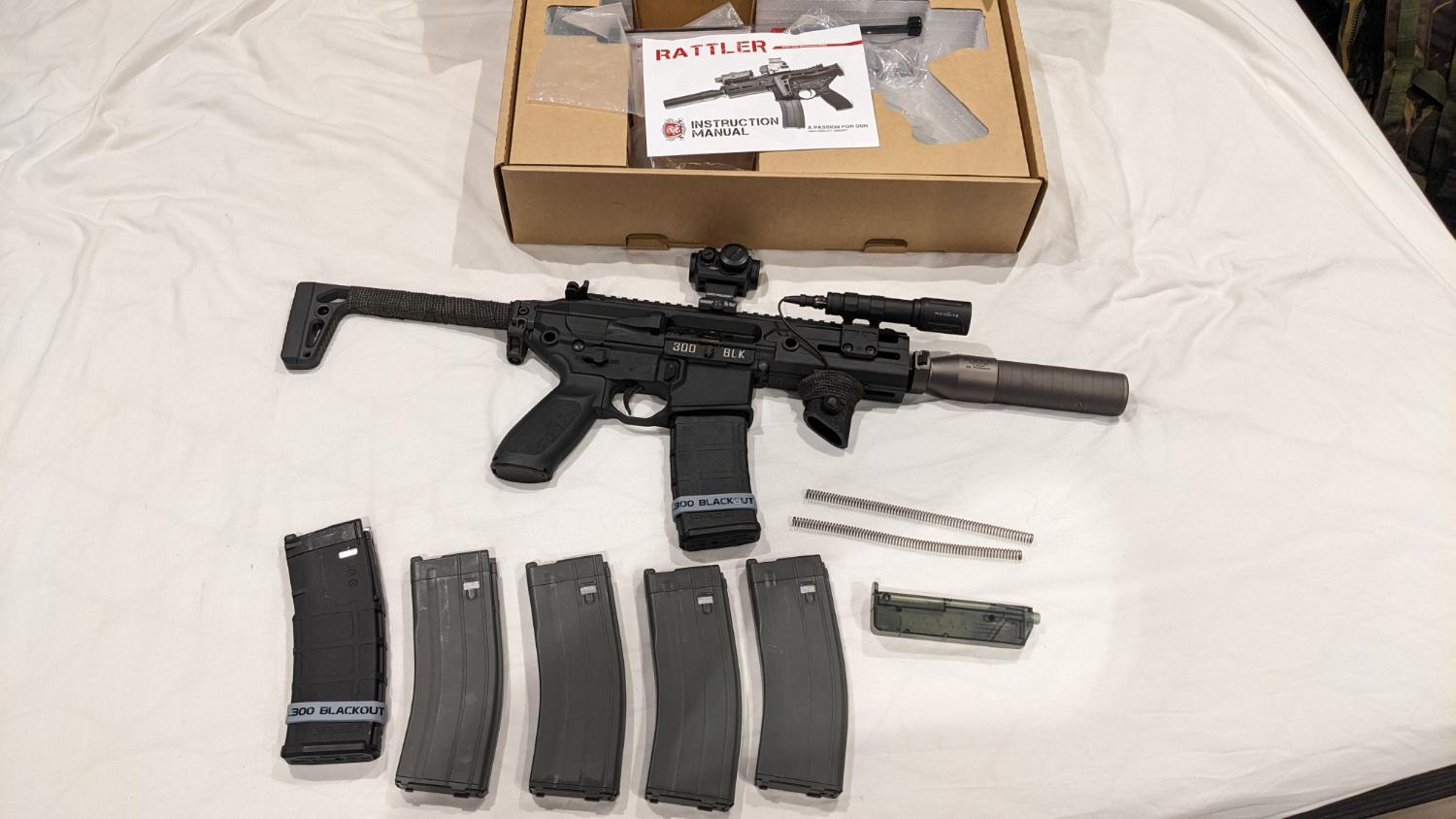 I am reluctantly selling this as it is a beautiful RIF and decked out with all the bells and whistles, this Rattler lifts .36 and .40’s with ease and packs a punch. I have gone through the effort of solving all of the known faults with the apfg mcx series, and it is a whole different gun in comparison to out of the box performance. It has titanium bolts for the auto trip bar that is the perfect length and held in with some blue loctite, along with a titanium bolt carrier catch screw to make sure the bolt doesn’t get worn down. The lower receiver is safe from cracking with the black variable buffer, and with the winter recoil springs installed the hop is very consistent. The gun comes with six magazines, two are the VFC V-Mags (P-Mags) and the other four are the bog standard VFC GBB Magazines; along with all of the accessories that came in the box. The price includes postage and PayPal fees, I will list the upgrades and attachments below: