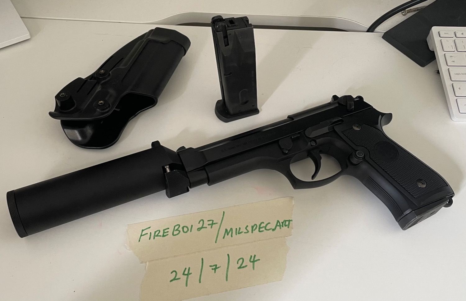 For Sale: Tokyo Marui M9 Military with RGW Knights Armament XM9 Snap on Suppressor. With 2x magazines and Blackhawk SERPA holster