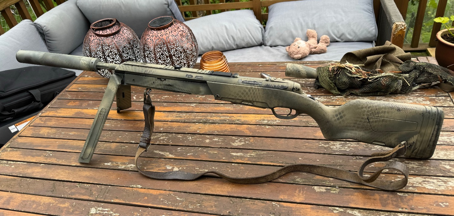 This Steyr has never let me down and has great range out of the box. It has a red H nub inside, TDC fitted and a Swiss Arms GOOB suppressor on, which works brilliantly.