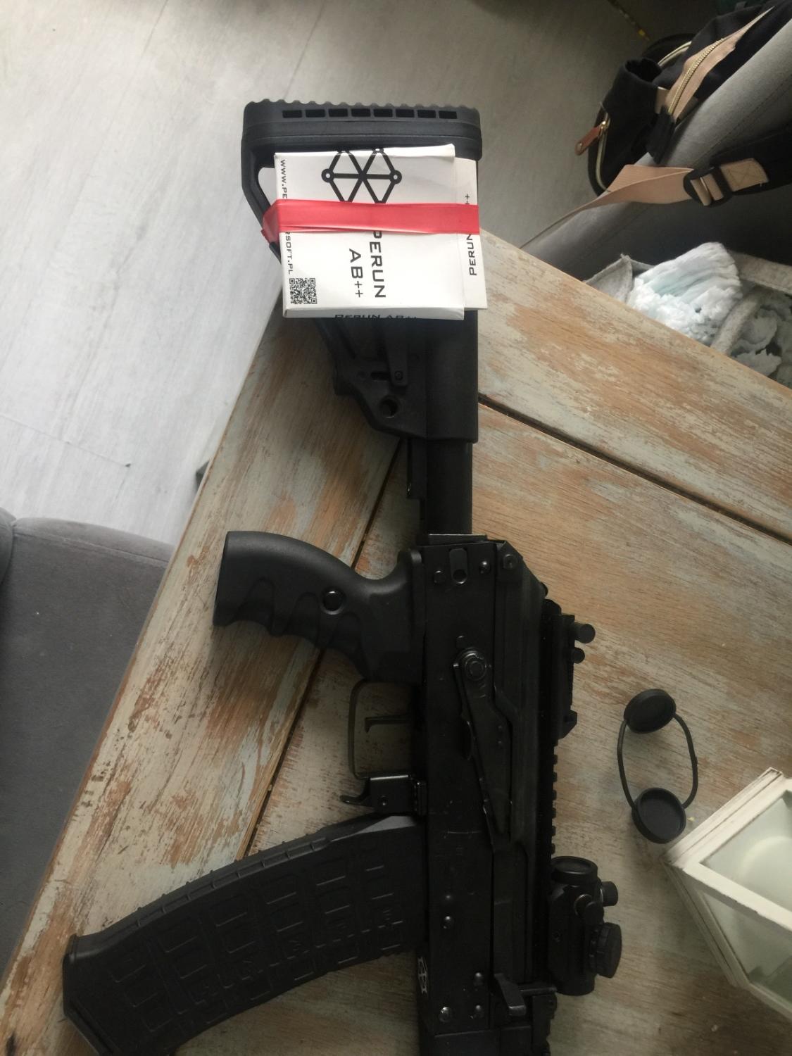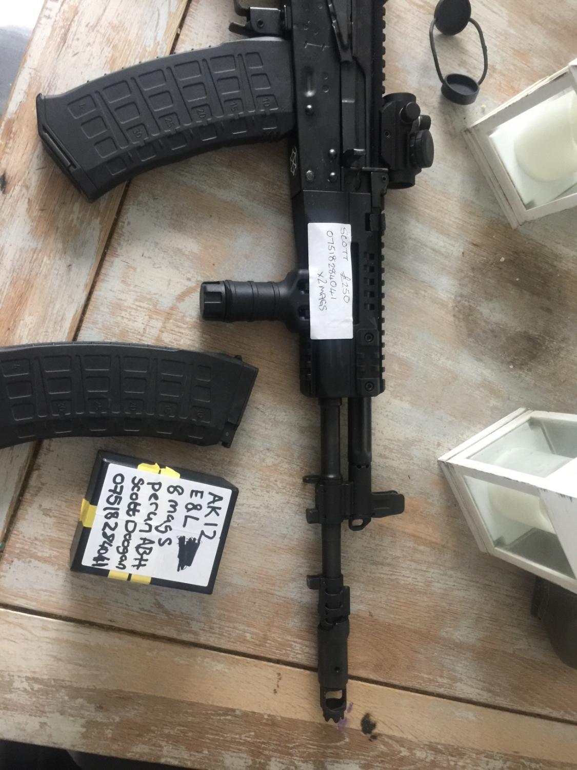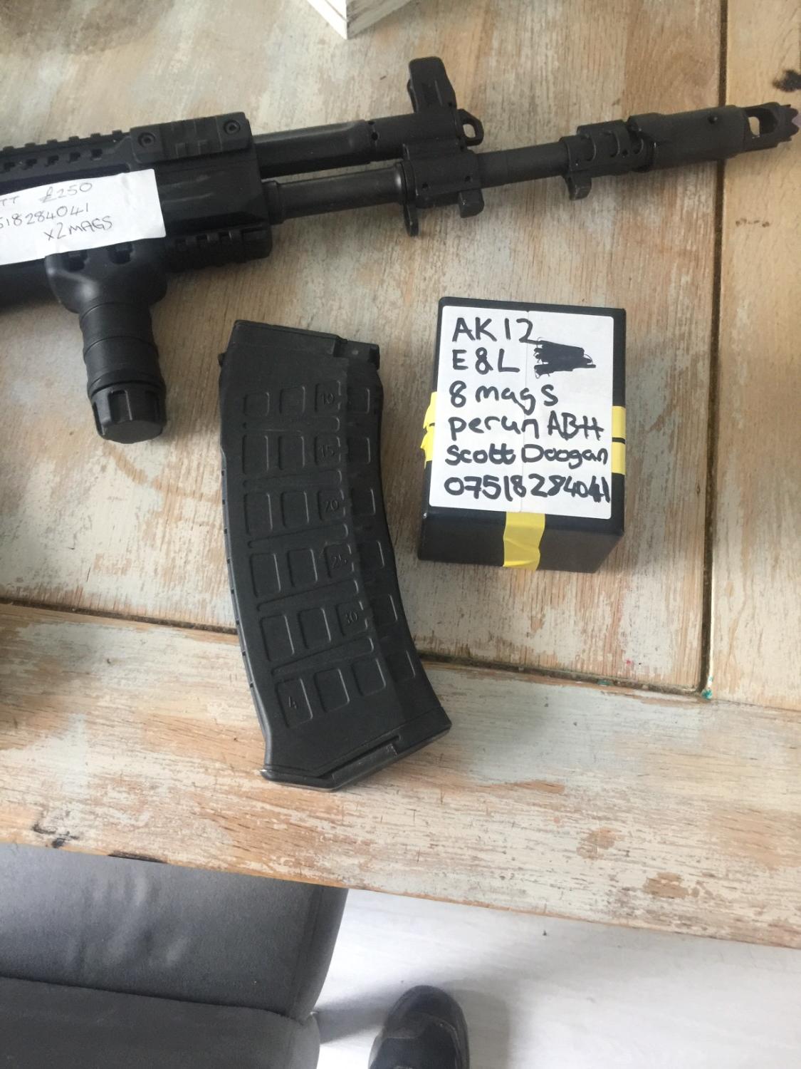 E&l ak12, perun mosfet and program cards, flat blade trigger, wired to stock tube with deans connector, grip and sight + riser included, shs high speed motor, maple leaf hop rubber and omega nub,m95 spring, great on 28s to 30s, comes with two ak12 150 mid caps.