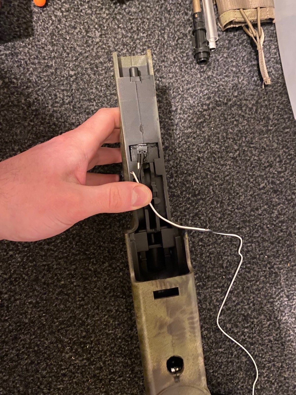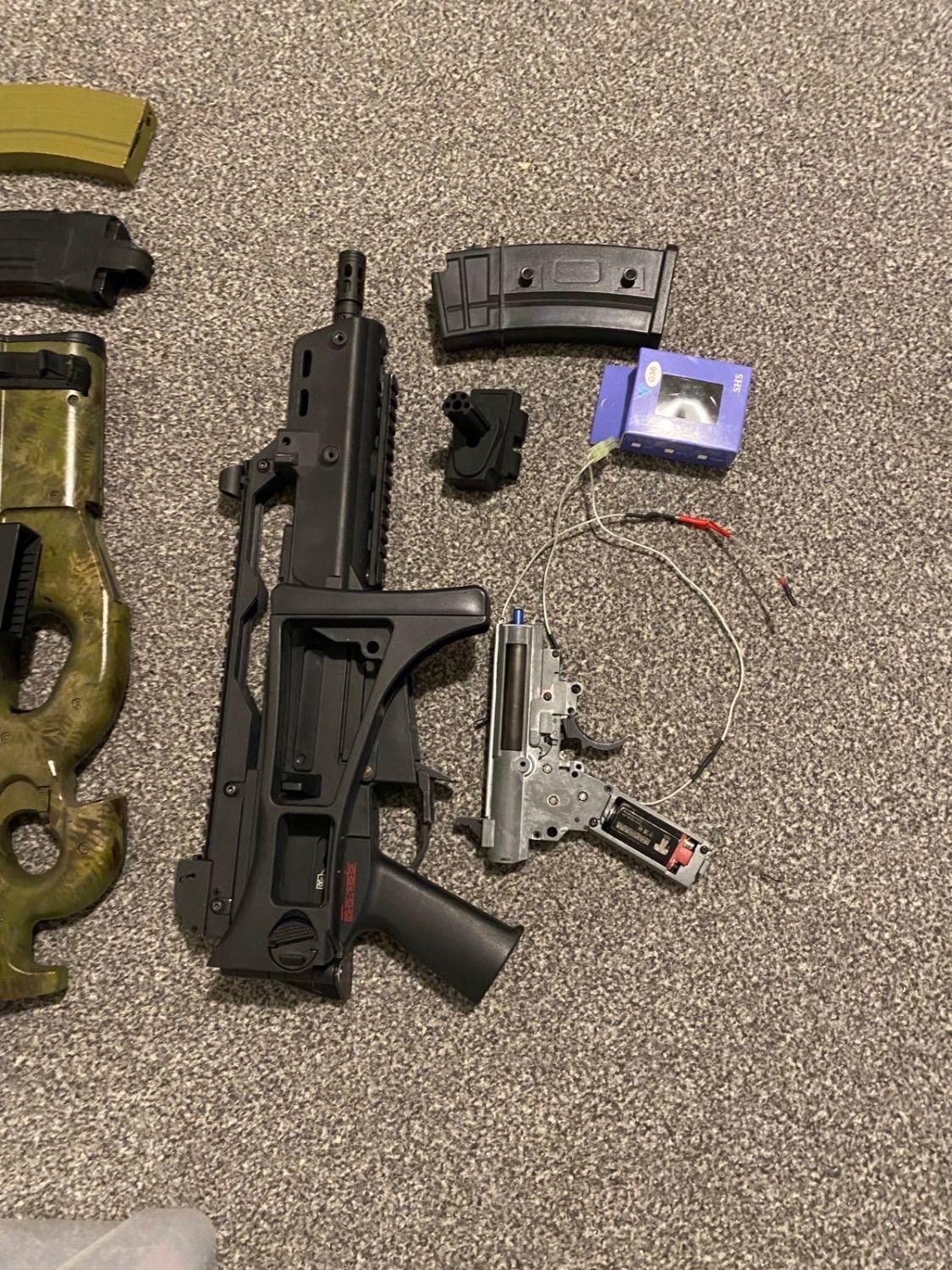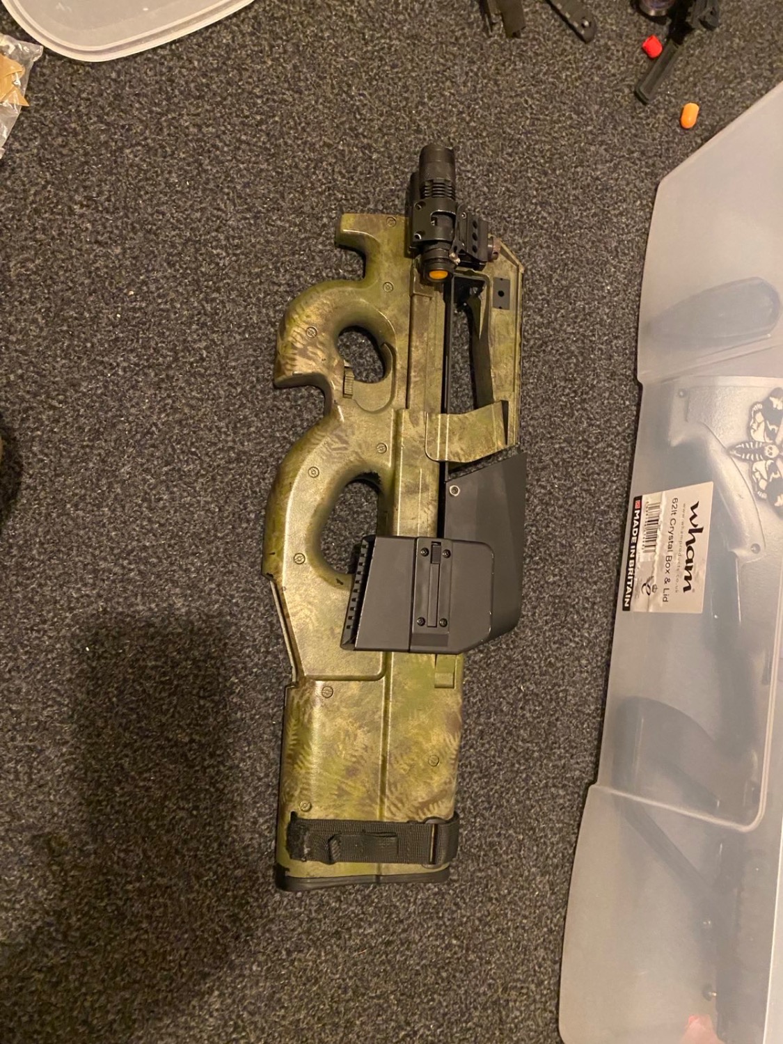 P90 with predator attachment to take m4 mags. (Spare parts for predator attachment too). Upgraded hop up. This had a micro switch trigger and used the gate Warfet but the wires damaged(shown in pics) so would need a repair.