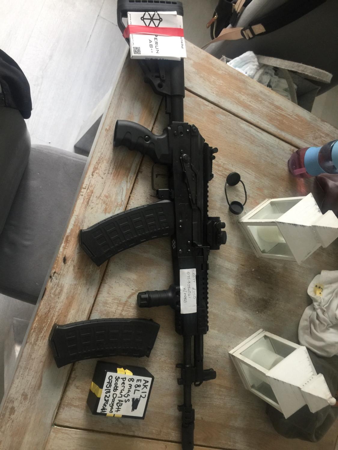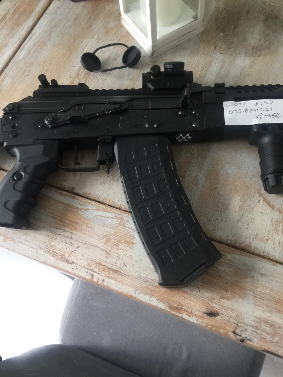 E&l ak12, perun mosfet and program cards, flat blade trigger, wired to stock tube with deans connector, grip and sight + riser included, shs high speed motor, maple leaf hop rubber and omega nub,m95 spring, great on 28s to 30s, comes with two ak12 150 mid caps.
