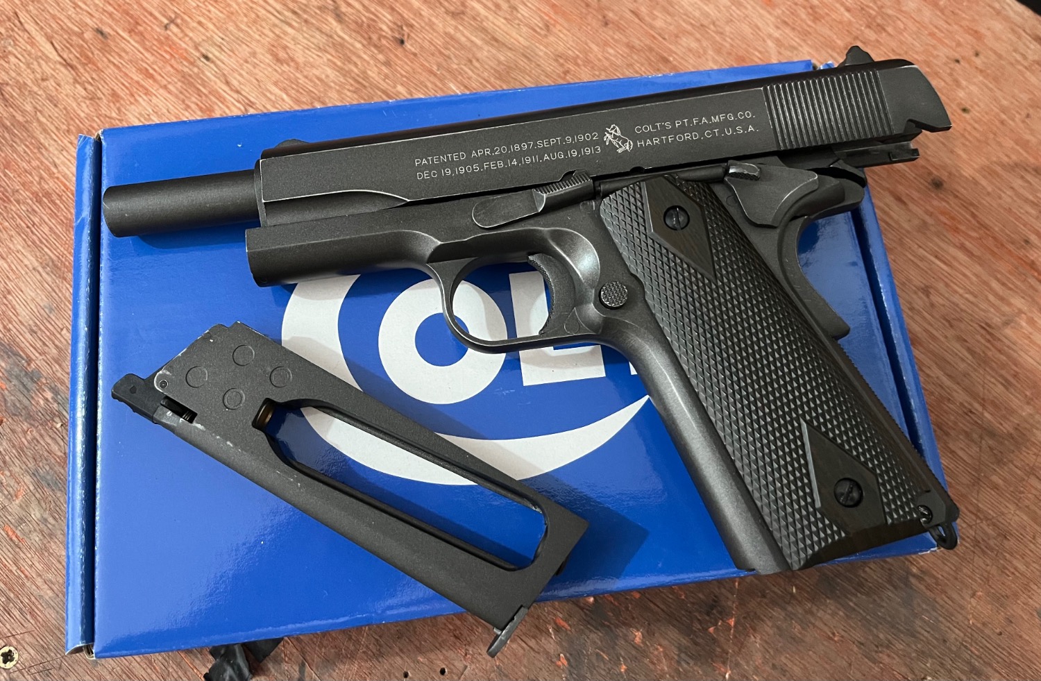 Cybergun co2 1911, full metal with imitation wood grips, fitted with ra tech npas so site legal. Comes with one leak free mag