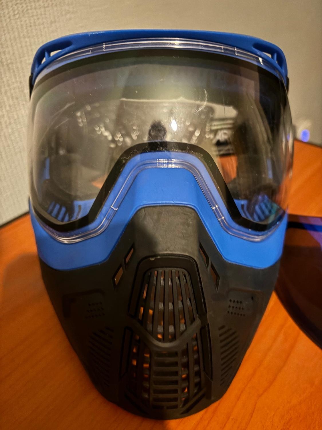 No chin strap, but in my opinion you don’t need it, most masks fog up with me, but this is really good, comes with spare visor, retail at £130 but I want 60 inc p&p