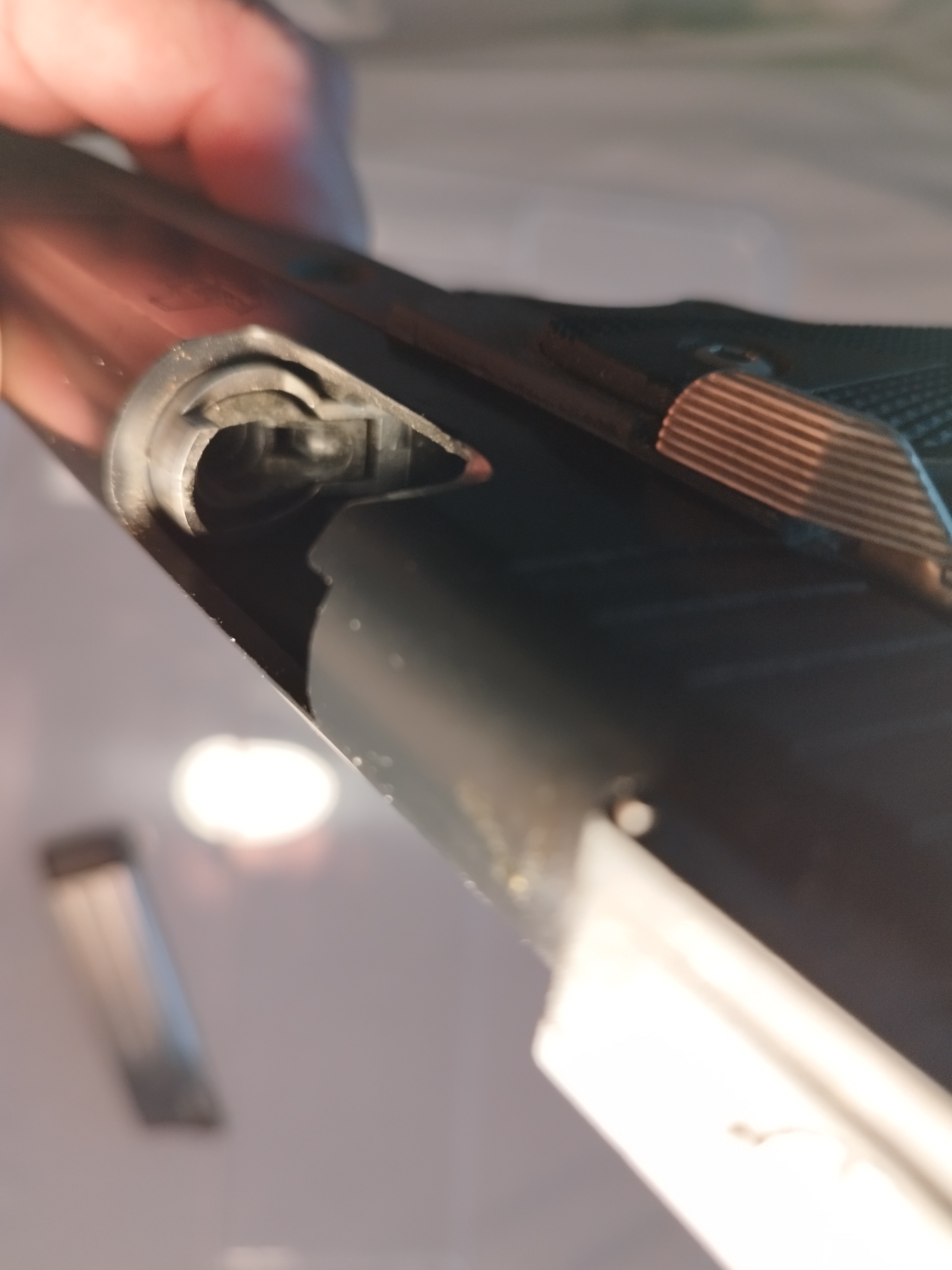 Thanks to an eagle eyed person there is a crack in the plastic near the rear sight. The metal part underneath is not cracked as far as I can see. I actually thought it was just a big scratch. Please be aware this is a used, very old piece and is subject to this sort of deterioration I would say due to age. (Happens to us all!)