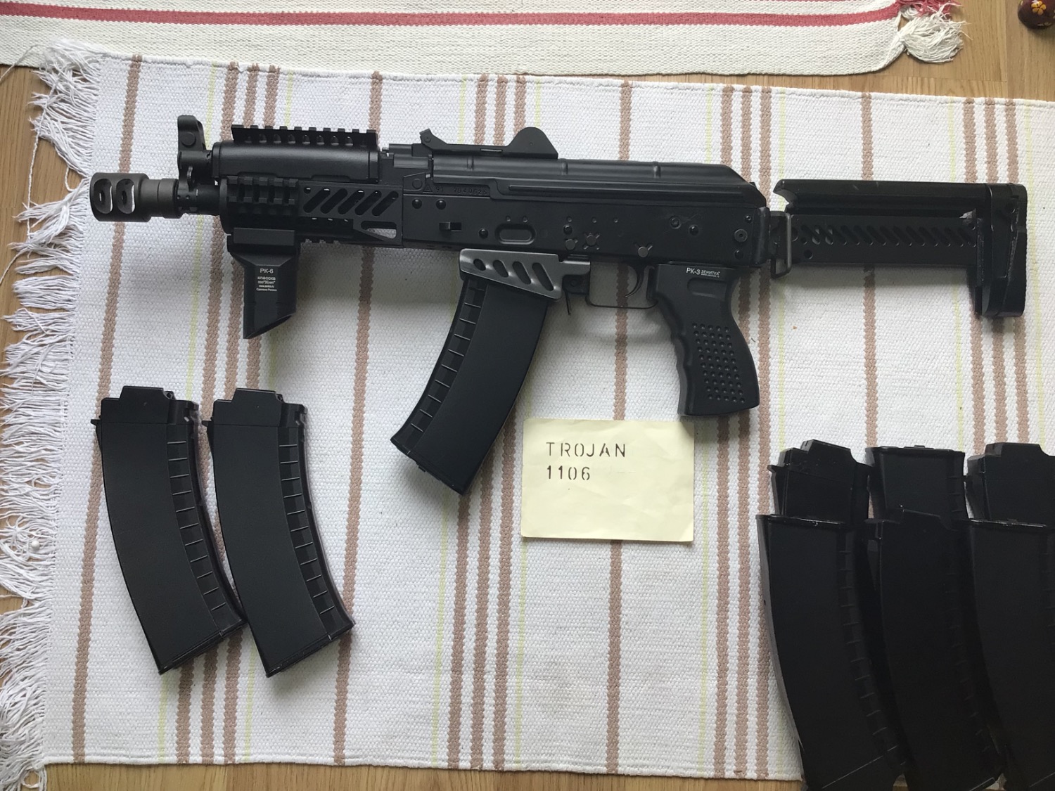 For sale, an upgraded (by Camoraids) Tokyo Marui recoil ak74su, with Zenitco furniture, all 9 mags pictured (2 are hicaps, rest mids). The stock is not foldable, has been set in place.