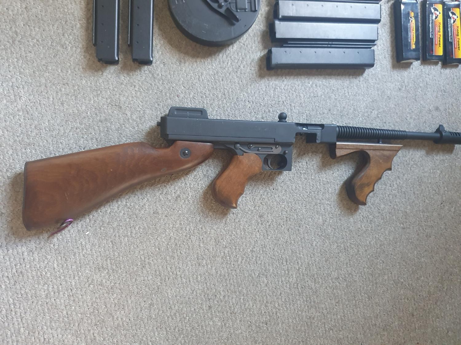 I'm looking to sell my all metal and wood 1928 Thompson as I am leaving the ww2 scene and need the space. This aeg has barely been used, though sadly i managed to scratch up the butt stock on a metal clasp on my webbing. It is surface and not a deep scratch.