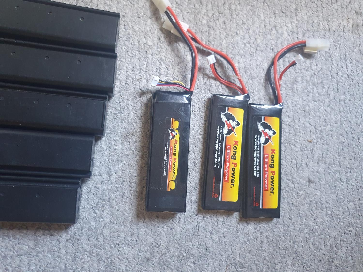 Comes with 3x hi cap magazines, 1x drum magazine and 5 mid cap magazines (all feed) and 3x li-Po batteries. (each of which has enough Mah and voltage to last a game day on their own).
