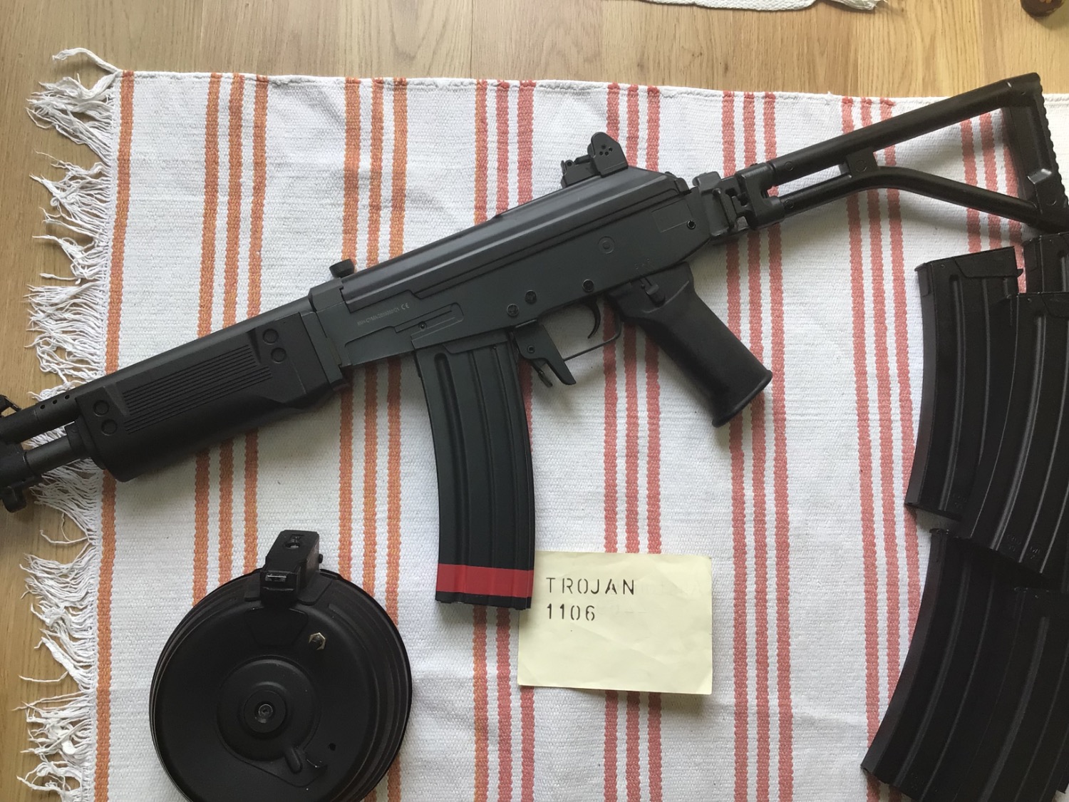 For sale, a used Cyma Galil with 6 midcaps, 1 hicap, and a drum mag. Fitted with a Madbull Black Python tightbore barrel, shoots at 330 fps on .20s. Much better range on .25s.