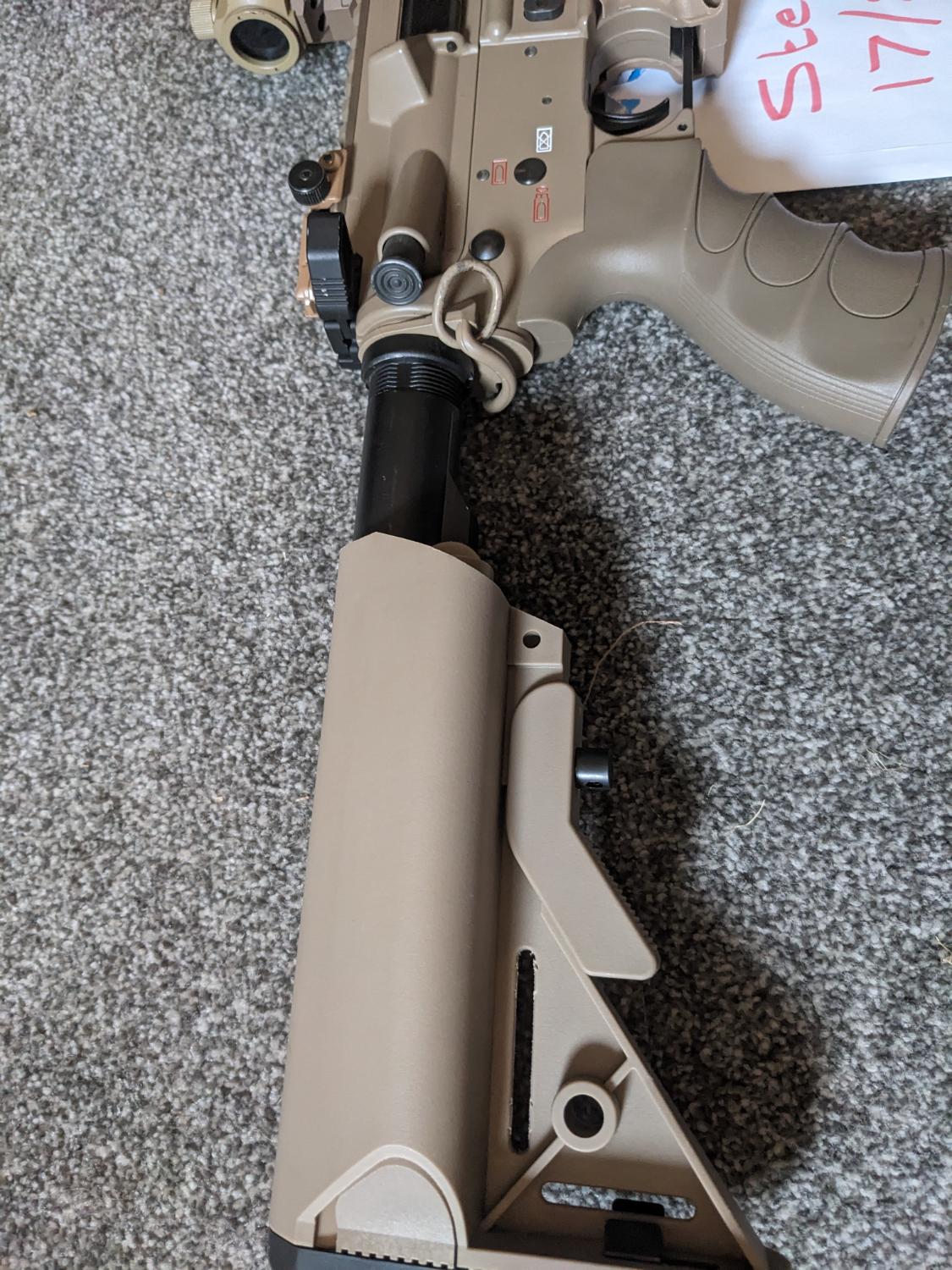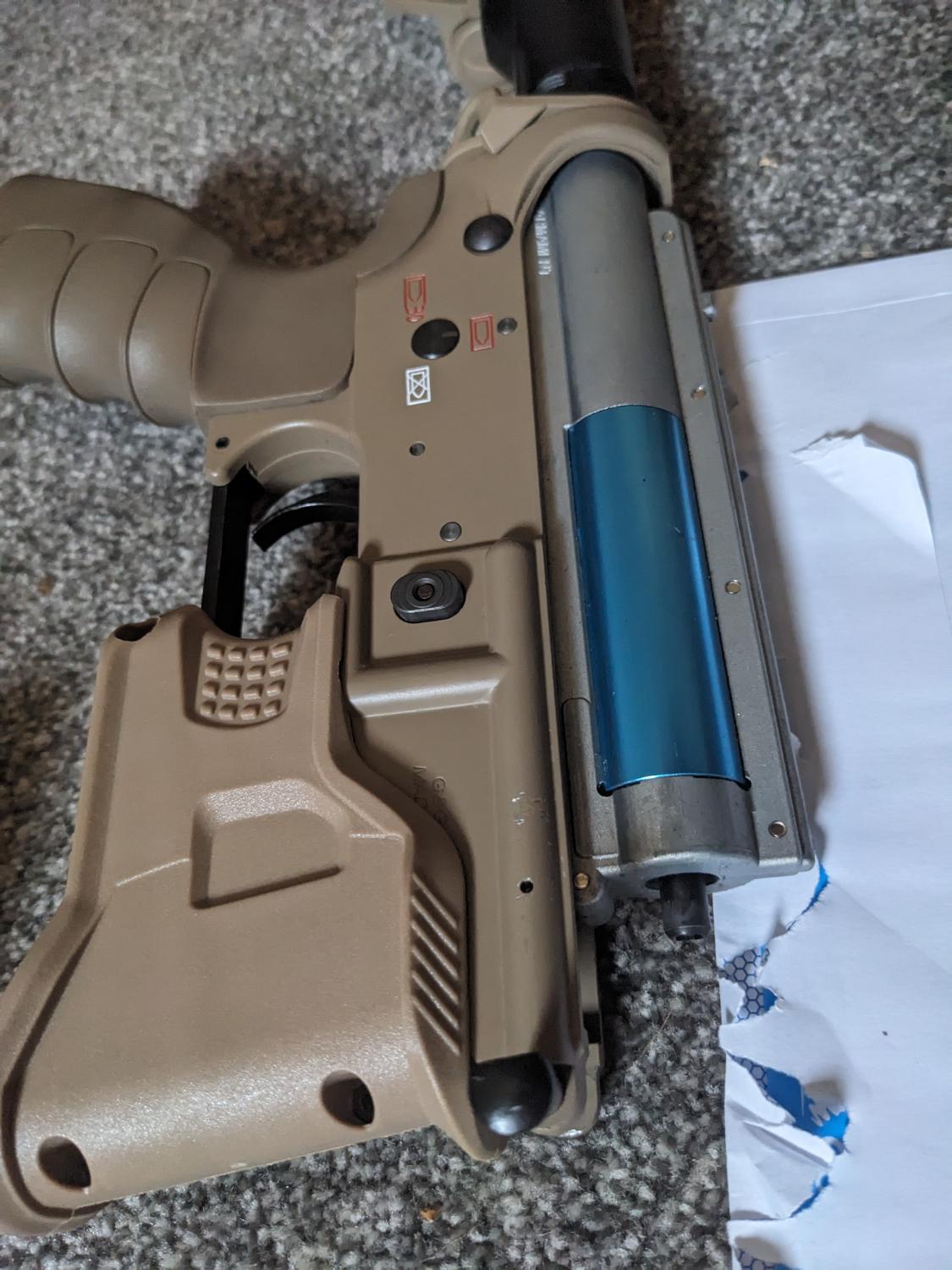 - mock 3d printed plastic suppressor (14mm ccw) to cover extended inner barrel, wrapped in tan sniper tape.