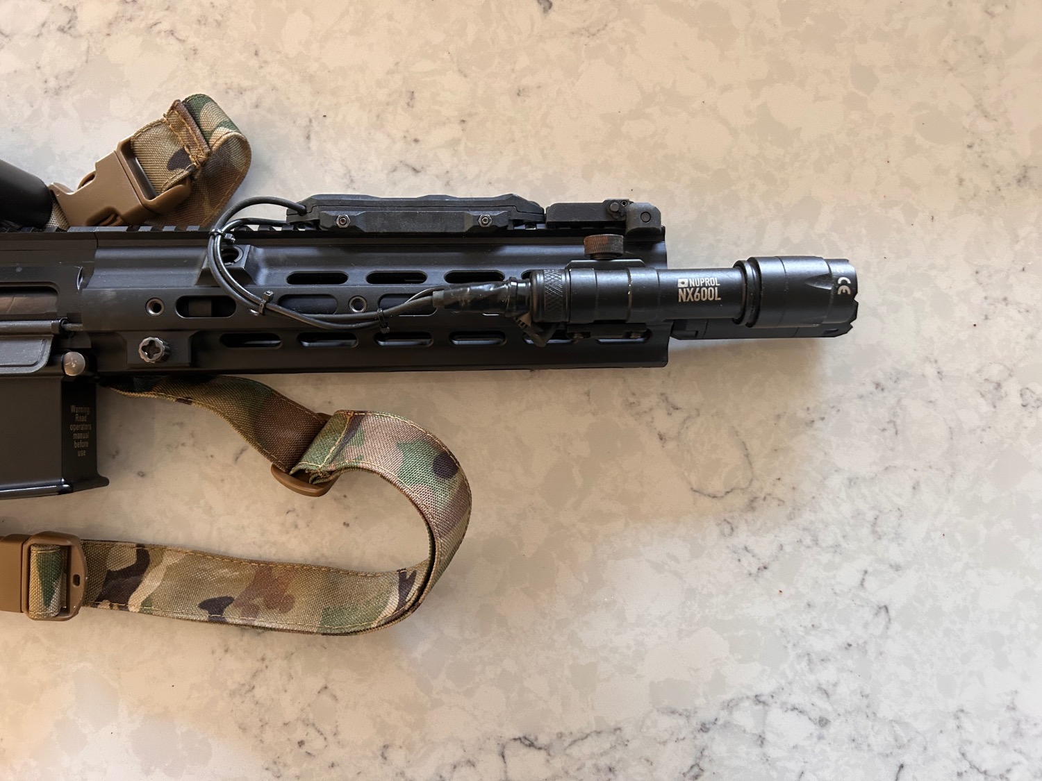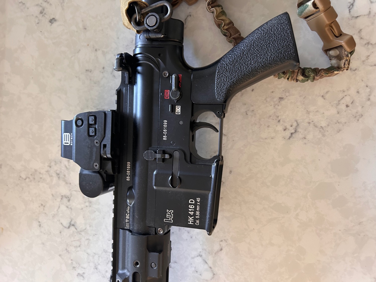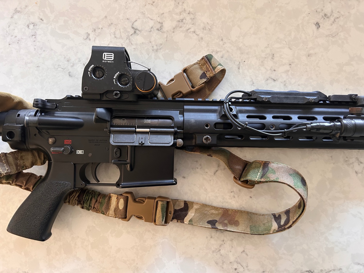 A nearly stock HK416 Tokyo Mariu – had a spring changed which uprates power to 340FPS with 0.2g BBs, deans connection, Prometheus spring guide, maple leaf hop rubber and nub