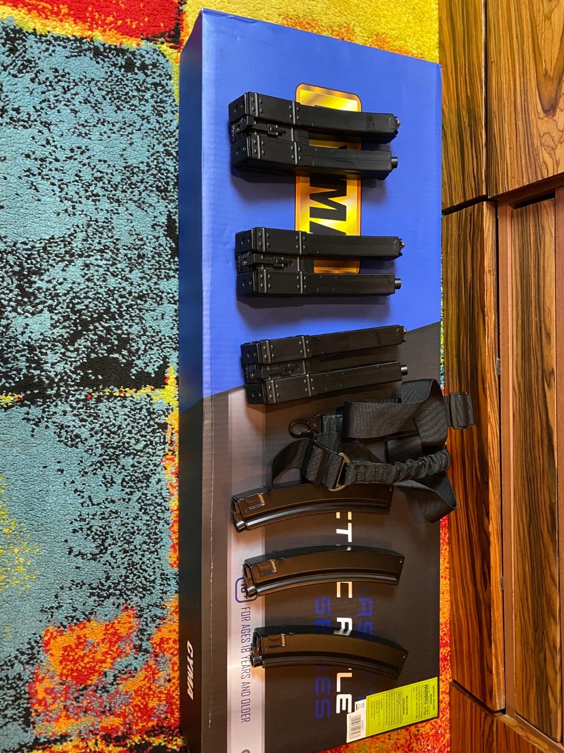 Selling brand new cyma mp5 blue edition, never being played, this is blue edition version so is upgraded by factory and have much better internals, there is 7 total magazines all new never being played too, new cnc nozzle, new spare spring I believe is for cqb, brand new sling, original battery, charger, cleaning rod, manual, box …