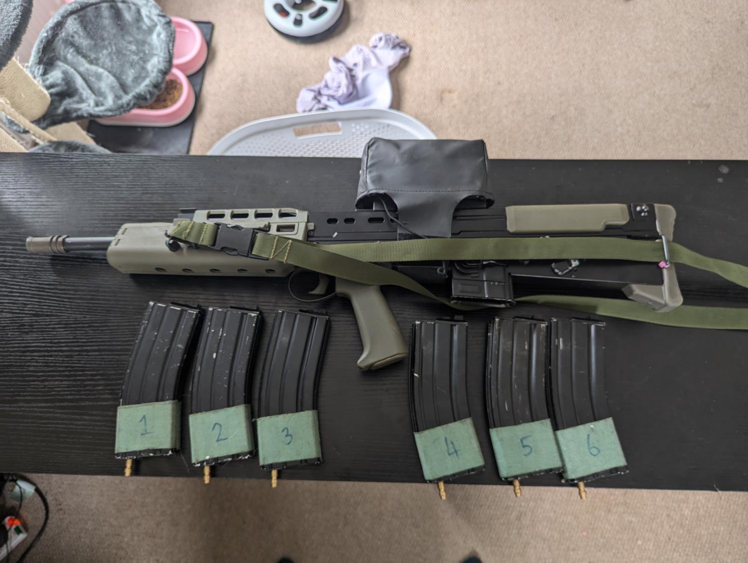 SUSAT, 6x 30rnd mags, sling, OG iron sights, standard green gas fill valves