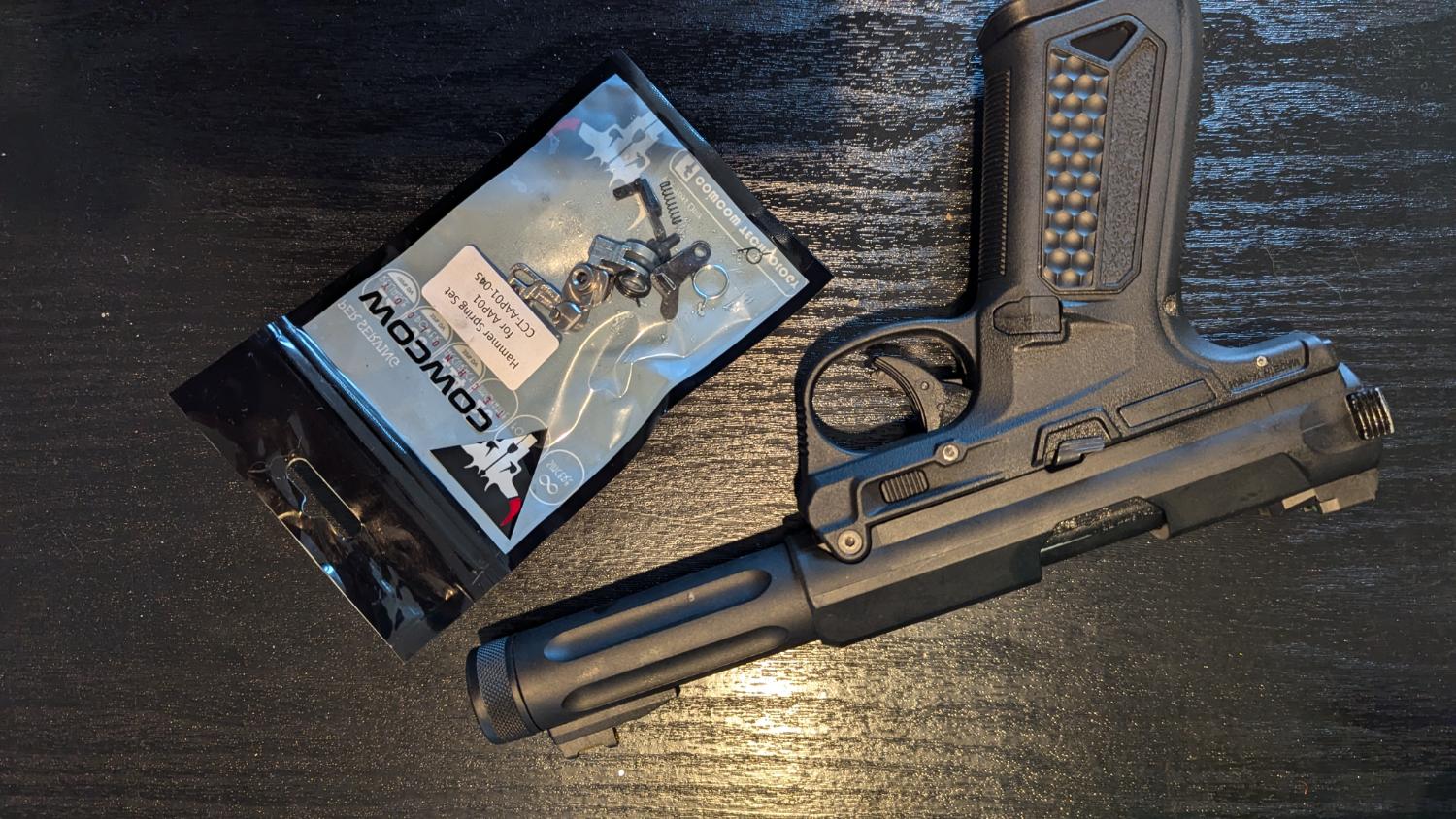 Sstainless Steel Hammer (as mentioned above). Stock hop unit. Original sear, fire pin lock, hammer, rotor, sear, hammer spring. 200% cowcow hammer spring