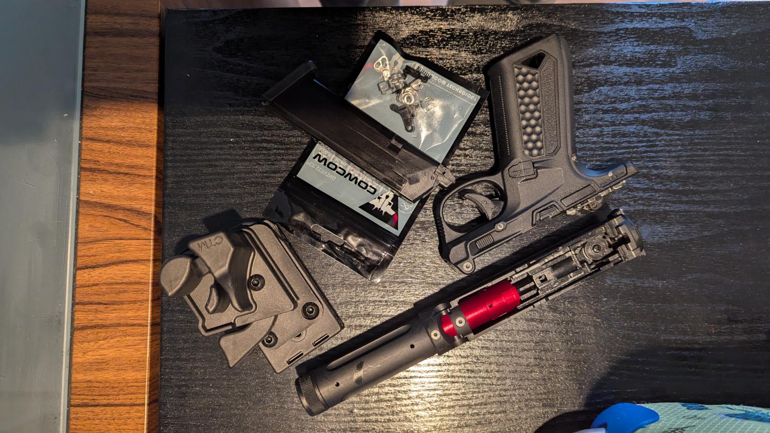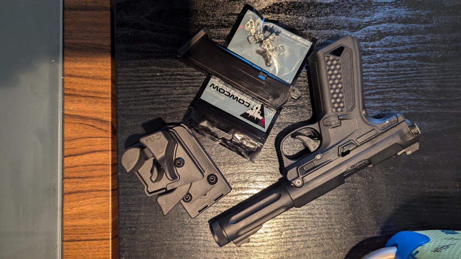 Comes with CTM RH Holster and 1 Magazine which holds gas but does require a new o-ring in the fill valve as it spits when you fill it.