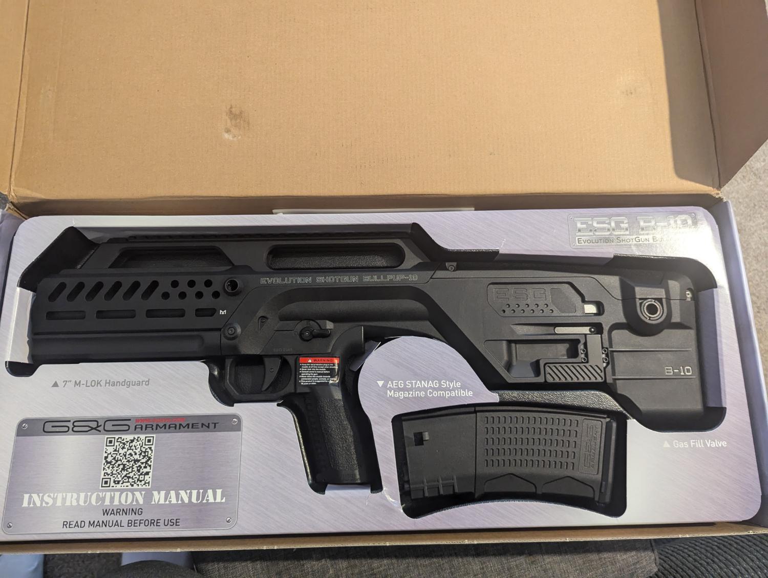 The G&G ESG B-10 Evolution Bullpup Shotgun is the evolutionary bullpup style barrel 5 or 10 round shotgun powered by gas and takes a AEG Magazine. Worked with all the different brand mags I tried.