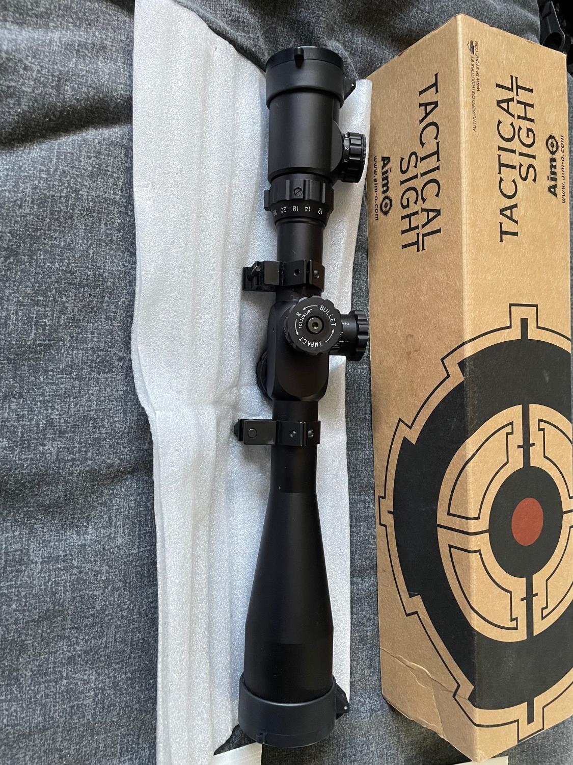 As new condition aim tactical scope. I purchased this scope by mistake as it was too magnified for my liking. It is comically very large and aggressive and would look great on a Barrett but feel its too much for Airsoft. Better for a display piece in my opinion It has been mounted onto my rifle and then removed and placed back in its packaging