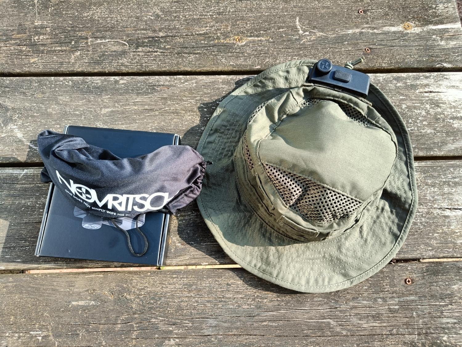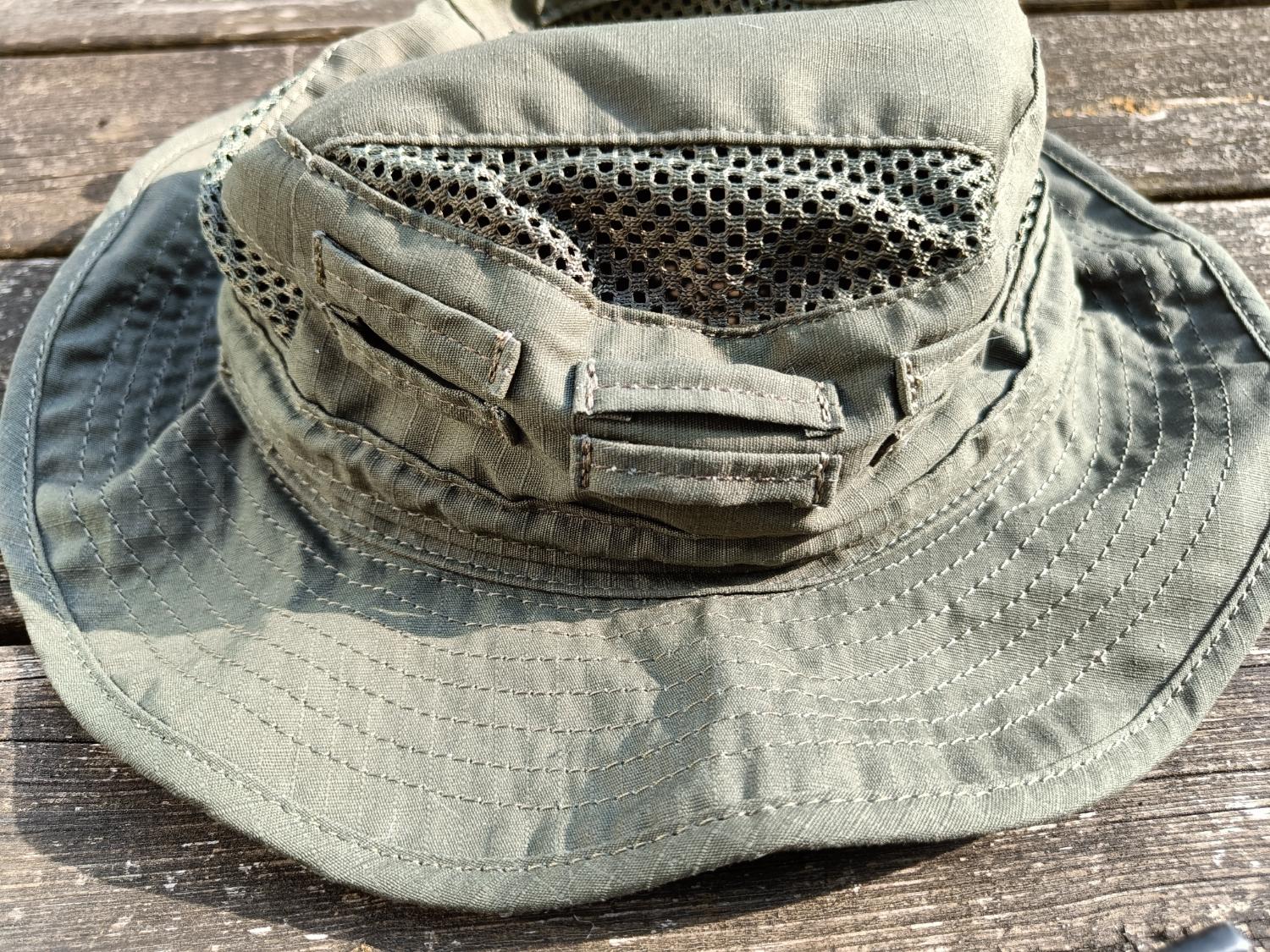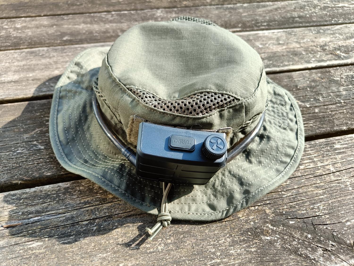 Opening in the brim to put hoses through for goggle ventilation as well as velcro and Molle on the back to carry either battery packs or anti-fog systems.